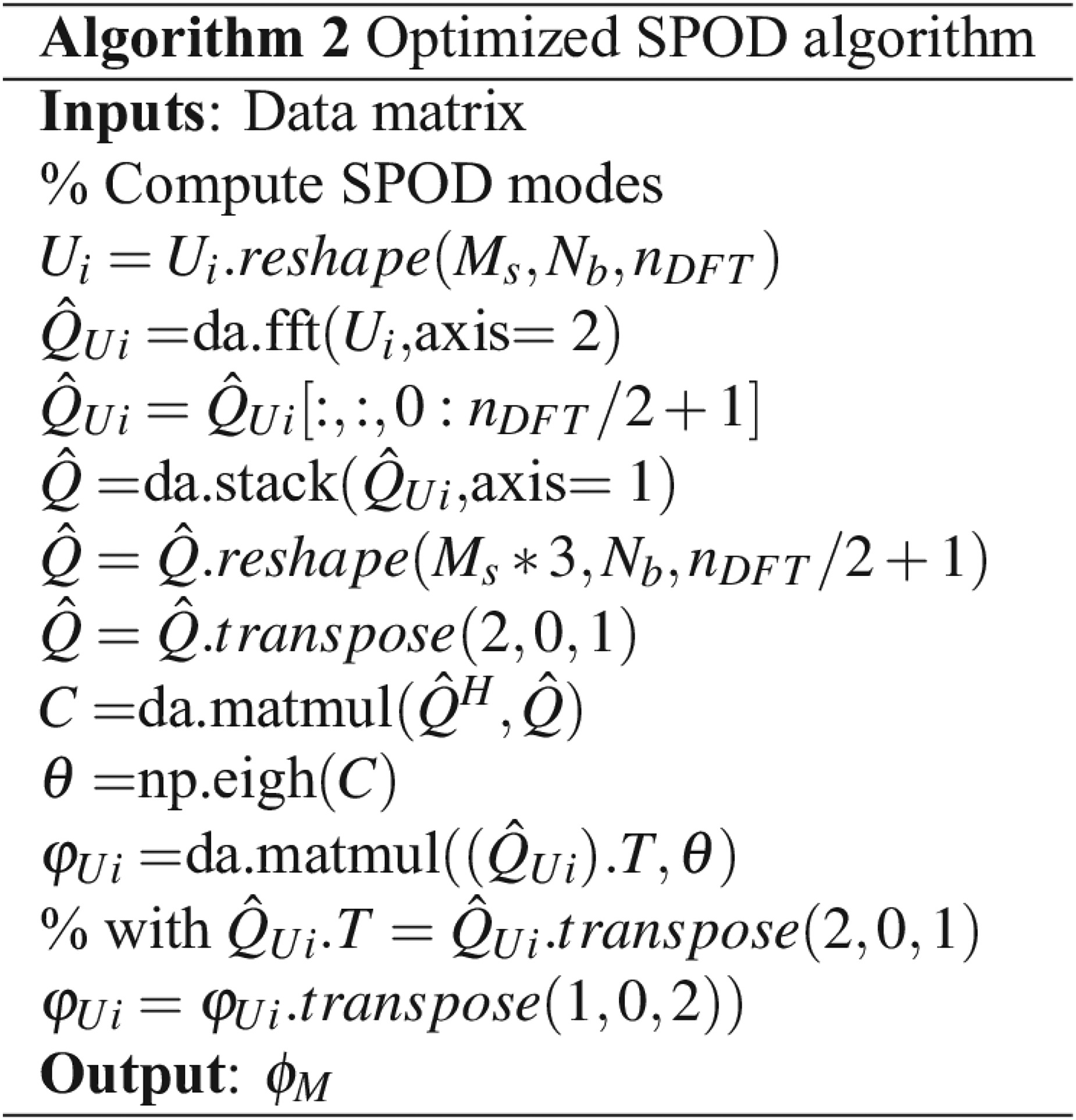 The SPOD computation, detailed in steps V to IX of Figure 1a, has been optimized by eliminating the use of for loops. The improved algorithm, outlined in Figure 2, takes advantage of the execution order in the eigenvector solver from the numpy library. The input data are rearranged using stacking and transposing operations, resulting in a three-dimensional array, C, with dimensions [nDFT/2+1,Nb,Nb]. The first dimension corresponds to the frequency index, and the other two dimensions represent the cross-correlation matrix for each frequency, Cifreq. The numpy function eigh is then applied, solving the eigenvector problem for each Cifreq. This optimization ensures that the output SPOD modes are equivalent to those produced by the baseline implementation.