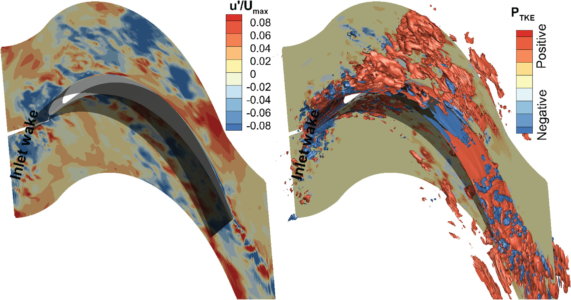 Figure 4 displays the contour plot of the fluctuating axial velocity u′ for a representative snapshot of the instantaneous flow field (on the left). The wake generated by the upstream blade is visible in the snapshot, marked as blue patterns at the domain’s inlet. Each snapshot contributes to the time mean PTKE defined in Equation 2. It is therefore possible to define the quota of PTKE for the kth snapshot at time (tk) as PTKE(tk)=−ρui(tk)′uj(tk)′∂ui¯∂xj. This instantaneous PTKE is shown as a contour plot with superimposed iso-surfaces at low and high production on the right of the picture. Intuitively, it is possible to associate the production of TKE with the inlet wake in the middle of the blade passage. Similarly, positive PTKE occurs in the boundary layer, where back-scatter (conversion of turbulence to mean kinetic energy) is also observed with negative value of PTKE. However, it is difficult to decouple the dynamical features by this approach. Namely, the volume integral of the instantaneous PTKE may only allow the identification of where losses occur.