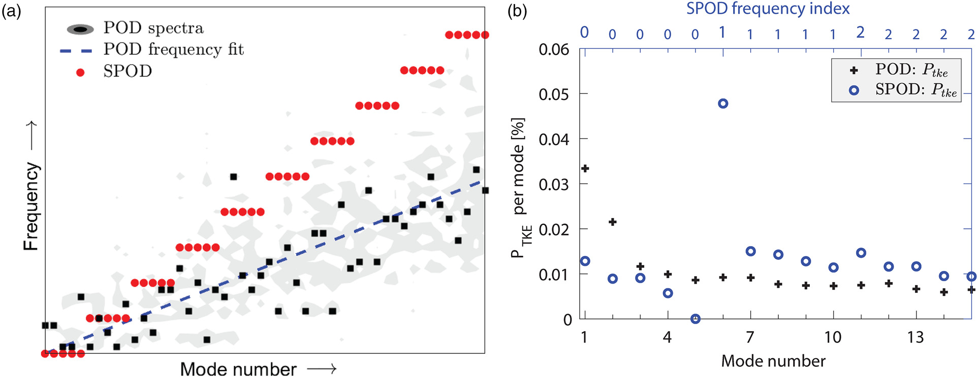 Modal decomposition results and comparison between POD and SPOD. The SPOD modes are arranged in descending order of energy, i.e. the first mode at a given frequency is the most energetic. (a) Frequency-mode relationship and (b) Integral value of PTKE per mode.