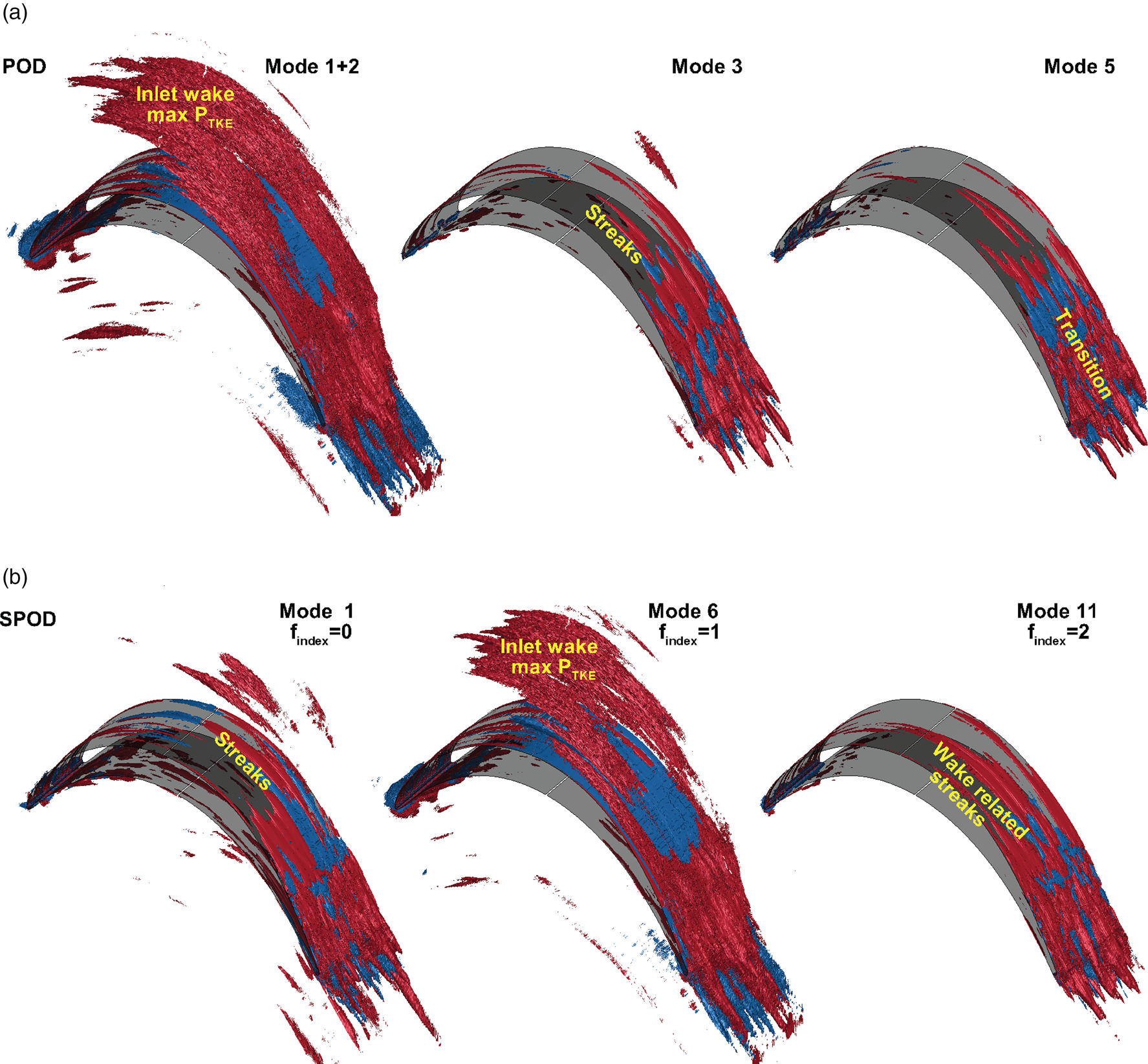 POD modes 3 and 5 capture structures close to the SPOD frequency index 0 and 2 (according to Figure 5a). Namely, the representation of SPOD mode 1 at 0 frequency index is close to POD mode 3, since both track low-frequency streaks (marked in yellow) in the fore part of the blade. This is not the case for SPOD mode 11 at frequency index 2. POD mode 5, in fact, highlights structures related to transition (as marked over the plot) since the iso-surfaces of PTKE appear small and their production (red contour) is limited to the rear part of the suction side (see also Lengani et al., 2022). On the other hand, SPOD mode number 11 at frequency index 2 still highlights a streamwise elongated area of high PTKE, being representative of streaky structures related to the inlet wake perturbations.