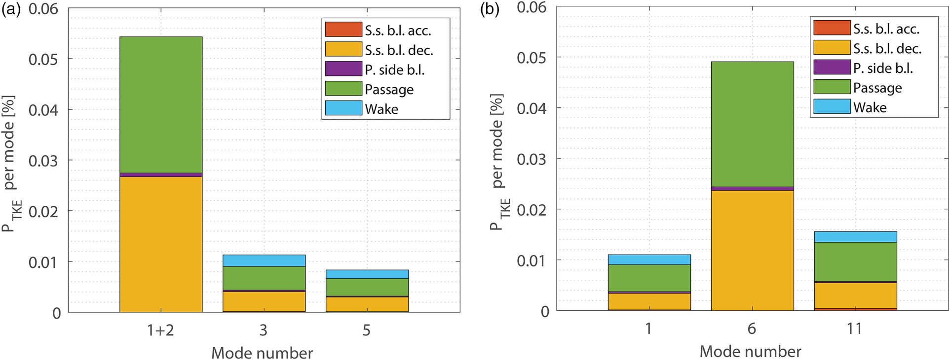 The observations above are confirmed and quantified by the bar charts of Figure 7, where the contribution of the modes under examination to the total PTKE is reported as a fraction for each subregion of interest within the computational domain. This is done by leveraging the properties of the volume integral approach, by which 5 different integration regions are defined: the accelerating part of the suction side in red, its decelerating part in yellow, the pressure side in purple, the wake region (downstream of the trailing edge) in light blue and the passage region in green.