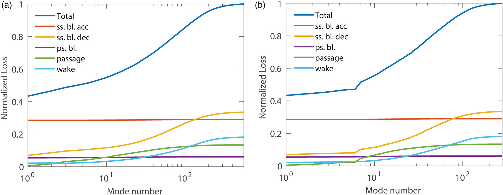 Cumulative contribution of modes to the overall losses: POD results (a), SPOD (b).