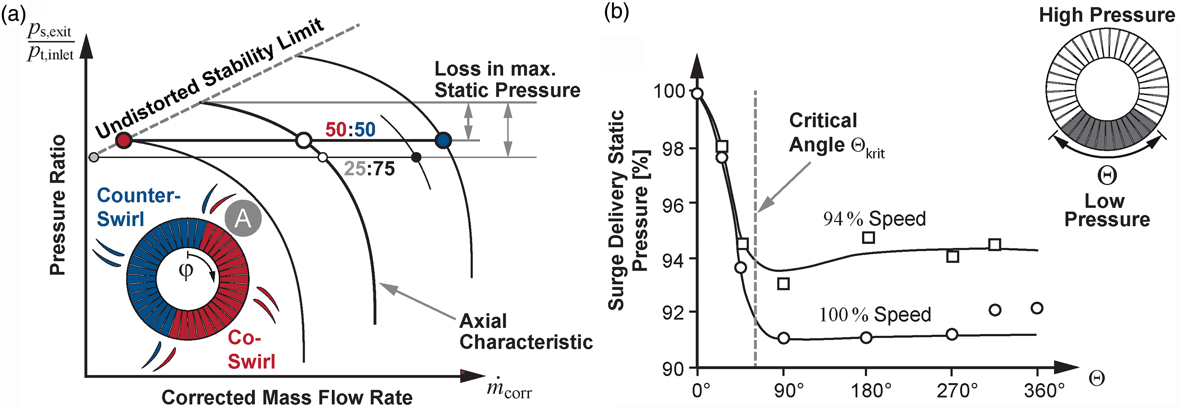 Influence of swirl distortions on global operating range. (a) Relative static pressure and (b) 0D-Distortion Parameters.