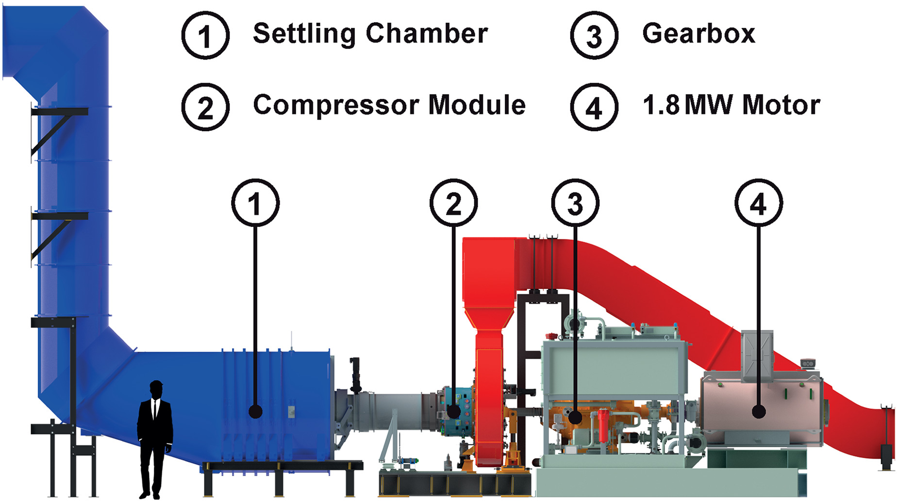The measurements are performed at the Transonic Compressor Darmstadt 2 test rig (TCD2). The rig is shown in Figure 2. It features an open loop configuration and is powered by a 1.8MW AC-motor, which enables Mach similarity. The test object comprises the first 1.5-stages of a gas turbine compressor, designed by Siemens Energy AG. The mass flow rate (up to approx. 28kg/s) and thus the total pressure ratio (up to approx. 1.7) can be controlled via a traversable throttle ring downstream of the stage exit. To perform measurements with VIGV-induced swirl distortions, the rig is modified. EC-drives enable the simultaneous adjustment of the angle of attack on each individual vane. A cross section of the compressor module is shown in Figure 3. The rig features extensive instrumentation in the different axial measurement planes. A 5-hole probe (5HP) at the rotor inlet measurement plane (RI) facilitates the measurement of absolute flow angles, total and static pressure as well as derived quantities, e.g. mass flow densities or relative flow angles. The probe can be traversed in radial direction to cover different relative channel heights. An axial array of 23 piezoresistive flush-mounted wall pressure transducers (WPTs) in the rotor ring enables the rotor relative measurement of static pressure at the rotor tip (RT). At the rotor exit (RE) and the stage exit (SE) total pressures and temperatures are measured via Kiel rakes and a 5HP-rake. A more detailed description of the rig and its instrumentation is given by Kunkel et al. (2019).