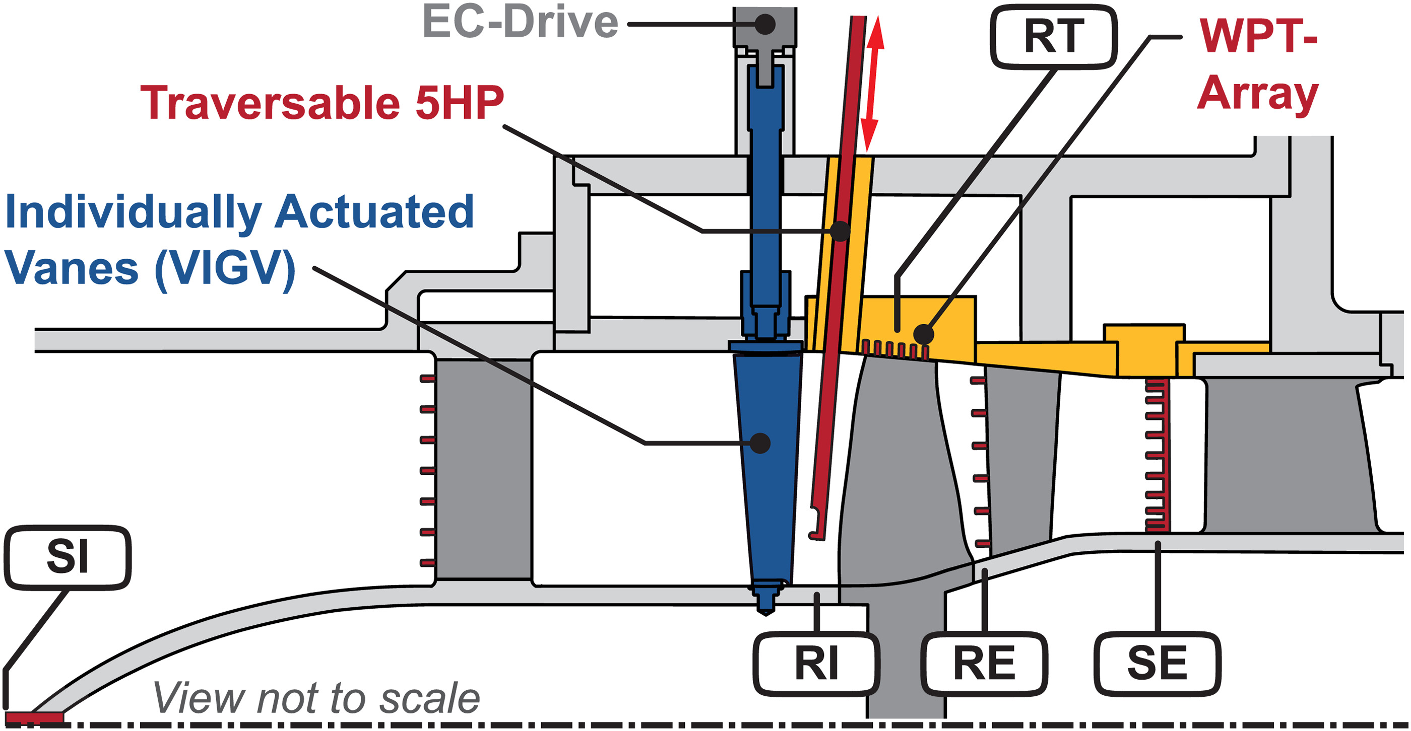The investigation of rotationally non-symmetric flow requires measurements of the whole annulus in all axial planes. This is achieved by circumferentially traversable instrumentation. All elements depicted in yellow in Figure 3 can be rotated accordingly. In combination with the possibility to position the single vanes individually, 360∘-measurements relative to the VIGV pattern are feasible while maintaining the clocking between VIGV and stator. For more information regarding the measurement procedures and the ability to resolve deviations in VIGV angle, see Karl et al. (2023).