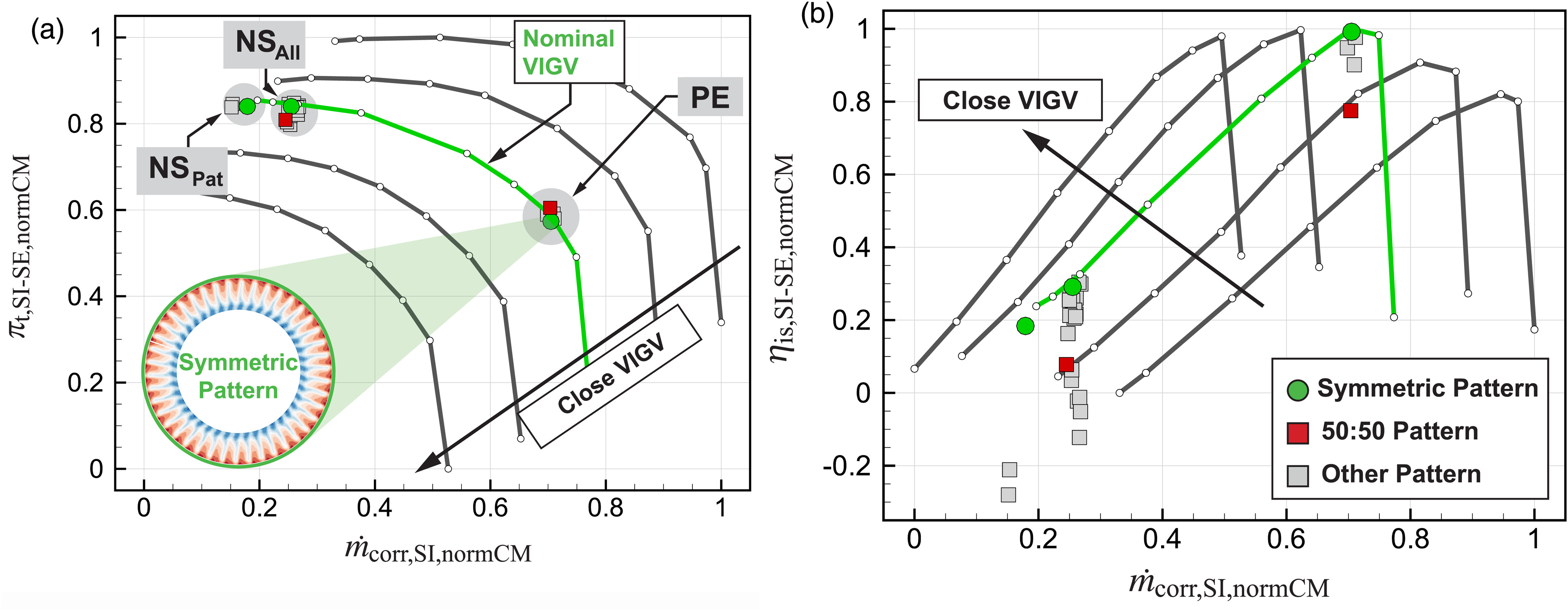 Besides of the undistorted characteristics, the aa-results of 360∘-measurements of various asymmetric VIGV patterns are depicted as squares. For comparison, the green symbols indicate the respective aa-results of the symmetric pattern. At the peak efficiency operating point (PE) the mass flow rate is constant due to the above described procedure of setting the patterns and the total pressure ratio is barely changed by the distorted flow (<1%). The measurements concur with the PCM assumption: The total-to-static pressure rise ps,SE/pt,SI at PE (not shown here) is almost identical for all patterns and the circumferential variation of static exit pressure is negligible. Closer to the stability limit all patterns show a slight decrease in pressure ratio at the near stall operating point representative for all patterns (NSAll), indicating additional losses and a reduced operating range compared to the undistorted case. The minimal mass flow rate for each individual pattern (NSPat) depends on the shape of the distortion and can be higher or even lower than for the nominal case. For all VIGV patterns, the isentropic efficiency of the compressor is significantly decreased compared to the undistorted case. For the 50:50-pattern the reduction is >3% at PE and at NSAll.