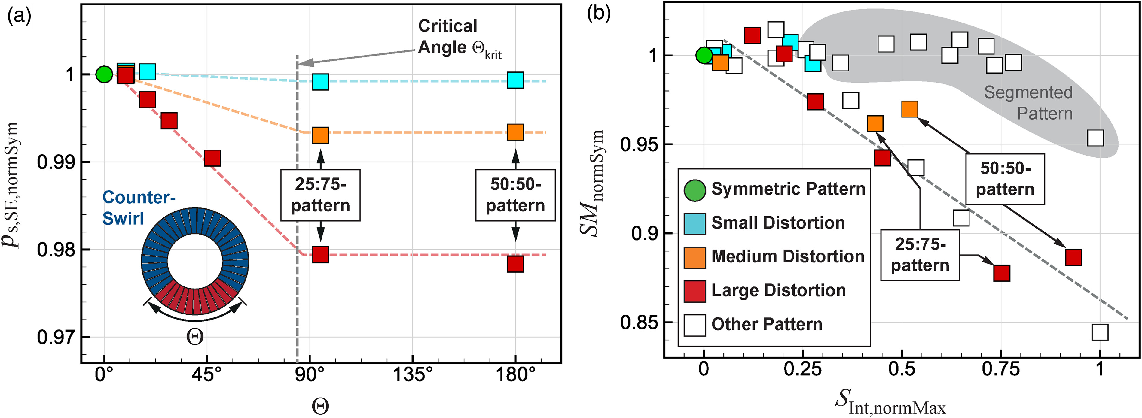 which uses the corrected exit mass flow rate m˙corr,SE, and therefore considers both quantities, is used. Multiple swirl descriptors have been proposed to describe not only the intensity but also the shape of the distortion. For the presented data, a good correlation was found using the descriptor Swirl Intensity SInt from SAE Aerospace (2010). It quantifies the effective magnitude of the flow angle α with its integral over the whole circumference. In Figure 5b, a linear trend between both normalized quantities is observed. The SM of the 50:50- and the 25:75-patterns are similar, which is consistent with the previous observations. However, the respective values of the Swirl Intensity differ, as the definition of SInt neglects the critical angle. Additionally, deviations from the linear trend occur for patterns consisting of multiple segments (gray area). This might be attributed to a combination of the blade response time constant, which quantifies the sensitivity of the compressor blade to inlet distortions (Cousins, 2004), and the duration each blade spends in the distorted regions. For the segmented patterns, the time in the distorted sectors is apparently too small to affect the SM significantly.