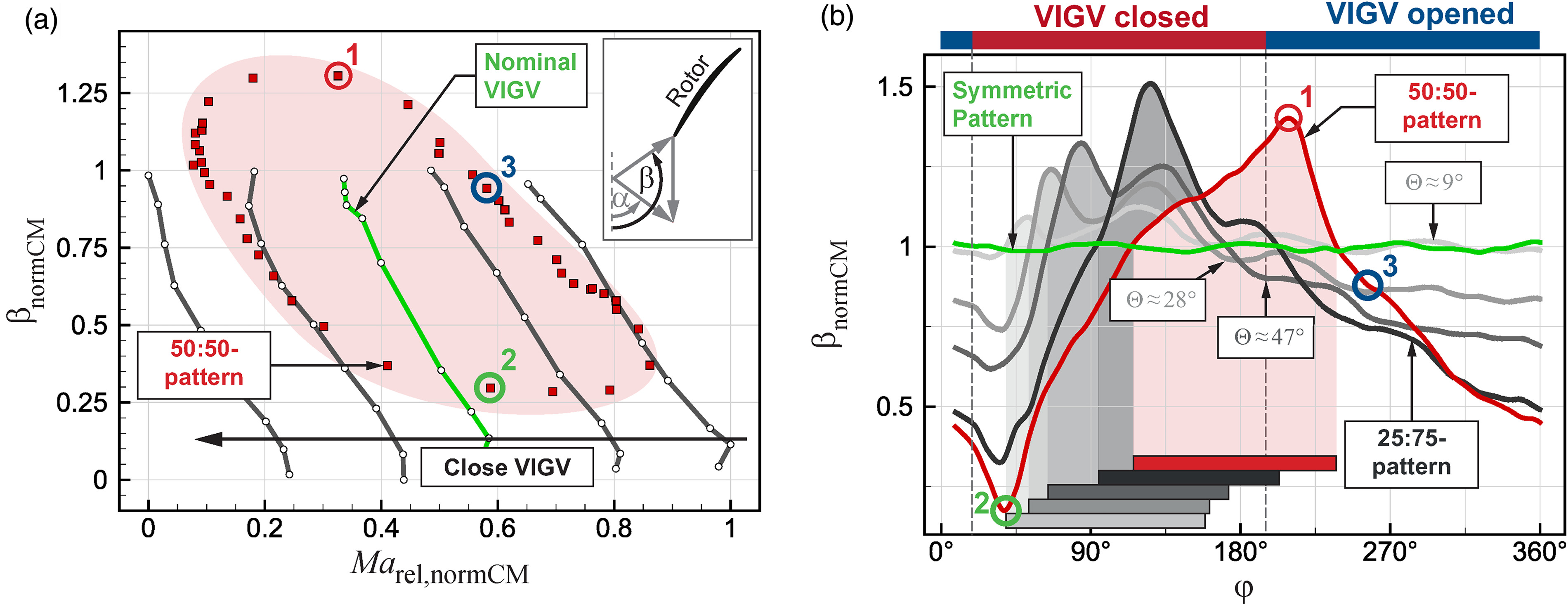 For tip critical rotors, compressor instability originates at the blade tip. The relative circumferential flow angle β and the relative Mach number Marel influence the shock topology. Their passage-wise aa-values can be calculated from the 5HP data. In Figure 6a both quantities are depicted for the same undistorted characteristics as in Figure 4. All near stall values of β are in the same order of magnitude, defining the critical incidence of the airfoil, and Marel varies with the respective VIGV- and throttle setting. The individual passages of the 50:50-pattern at NSAll are shown as well. A large variation in relative flow angle can be observed. As expected, the compressor locally operates at different operating points at different characteristics. However, the local operating points vary more than would be suggested from the VIGV pattern with only two distinct vane angles (compare Figure 1a). This is due to the developing mass flow redistribution. Single passages already operate beyond the critical incidence of the symmetric configurations. The maximum incidence is observed downstream of converging VIGV passage (see red markers “1” in all following figures). The minimum incidence develops downstream of the diverging VIGV passage and leads to operation close to the PE mass flow rate of the nominal configuration (see green markers “2”). In Figure 6b, the circumferential distribution of β at the rotor tip is depicted for 360∘-measurements of different counts of mis-staggered adjacent vanes. The measured flow angles at NSAll are extrapolated to the values at the respective last stable operating points NSPat. This is possible due to the relation between mass flow rate and relative flow angle (not shown here), which is strictly linear over the whole characteristic, and the small differences in mass flow rate. It is evident, that all different patterns locally operate beyond the maximum incidence of the symmetric configuration. While the minimum mass flow rates of the patterns change, that respective portion (see rectangular markers) of the circumference remains similar in size. Its circumferential extent at the stability limit is about 105∘, hence close to the determined critical angle. This is remarkable, as it cannot be derived from literature. It also explains the linear trend in Figure 5b, e.g. that for smaller distorted areas smaller mass flow rates and thus larger static pressure can be achieved until this circumferential extent, hence instability, is reached. However, both the 50:50- and 25:75-pattern, exhibit a distorted area of this size at NSPat at an identical mass flow rate. This is due to the local variation of mass flow at the rotor tip region, which influences the local value of β. An increasing count of mis-staggered vanes leads to a greater circumferential and radial redistribution of mass flow. Only for these two patterns this variation affects the entire circumference. In rotational direction, the mass flow rate continuously decreases downstream of the closed vanes and increases downstream of the opened vanes. This results in identical amplitudes of the local mass flow variation for both patterns and thus to an identical SM.