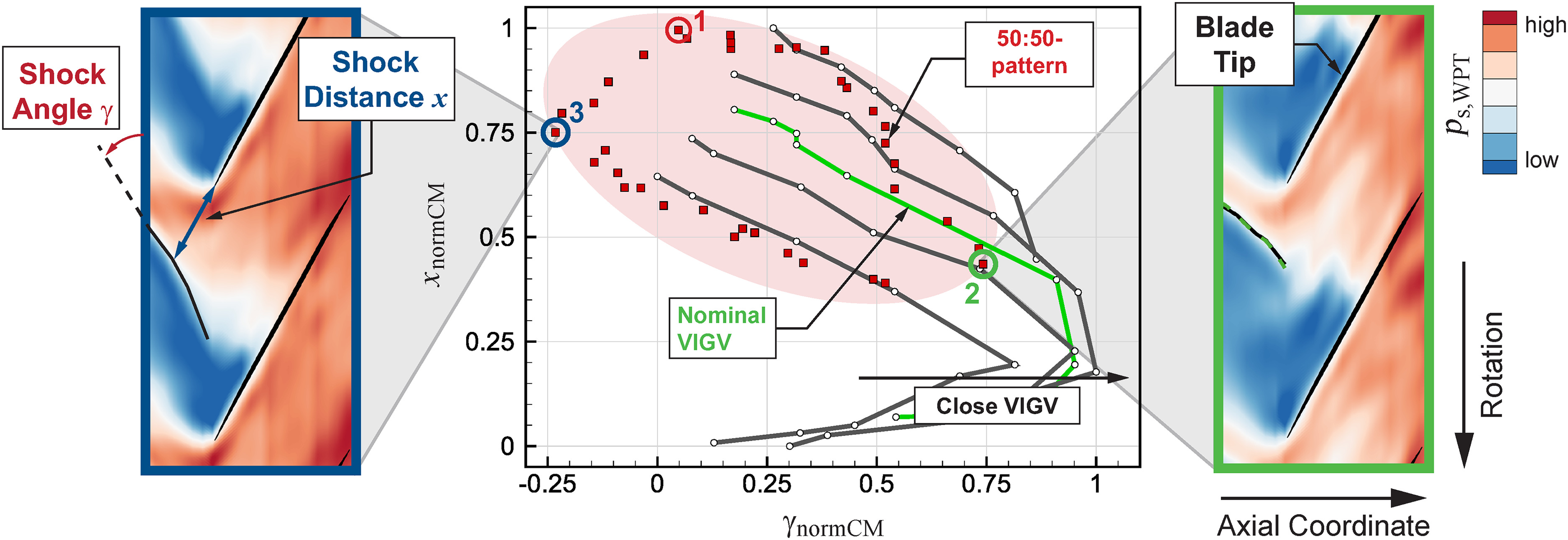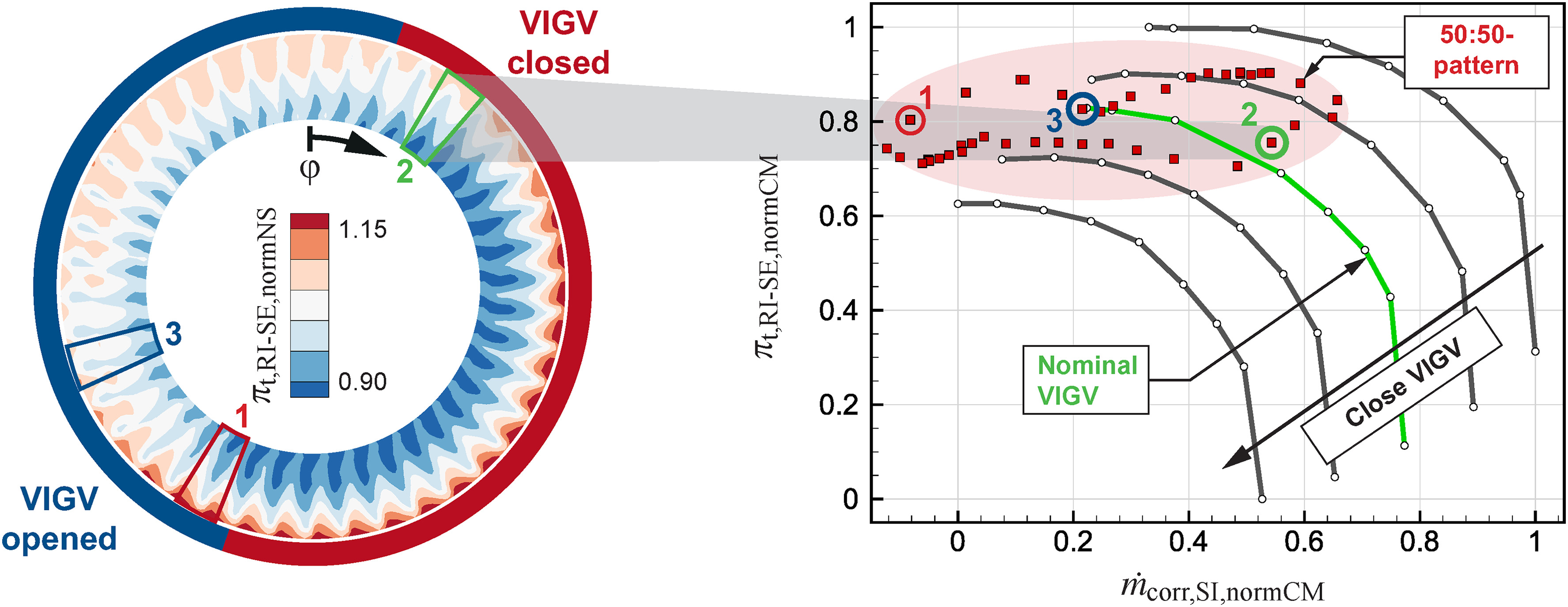 At measurement plane SE, data is acquired via a 5HP- and two Kiel rakes. Downstream of the stator, the absolute flow angle α locally varies by only ±1% around its mean value, which is similar to the mean value at the rotor inlet. This is a significant reduction in amplitude compared to the rotor inlet measurement plane (RI) and shows the damping effect of upstream vanes also described by SAE Aerospace (2010). Instead, the variations in total pressure and temperature increase to ≈±3% at RE and SE. In Figure 8 (left) the measured 360∘-flow field of πt,RI−SE for the 50:50-pattern is shown. All values are normalized with the global aa-mean value. The areas of opened and closed vanes are clearly distinguishable. As expected, the aa-pressure ratio per passage is lower for the closed area. However, the local maximum values are also located in this region at the blade tip. In general, larger radial gradients develop downstream of the closed VIGV, which indicates local operation close to the stability limit (Karl et al., 2023). The corresponding operating points for all individual passages are shown in Figure 8 (right). The respective mass flow rate is determined from the 5HP data at the rotor inlet. The matching between local mass flow and pressure at measurement plane SE was achieved via preliminary measurements of the phase difference in pressure and temperature between the two measurement planes. It is evident, that the local operating points follow the shape of the symmetric characteristics and fit the results from the measurement planes at the rotor inlet (RI) and the rotor tip (RT), especially for the passages downstream of the closed VIGV. The drop close to the stability limit in the opened section (see blue markers “3”) points toward additional losses and could explain the reduced pressure ratio of the 50:50-pattern in Figure 4a. It is mainly caused by the flow at the rotor tip, see 2D-field data in Figure 8 (left), and potentially related to the local shock topology: The data from measurement plane RT indicate the smallest shock angles at the respective circumferential position. A reduced efficiency resulting from this pronounced off-design operation is likely.