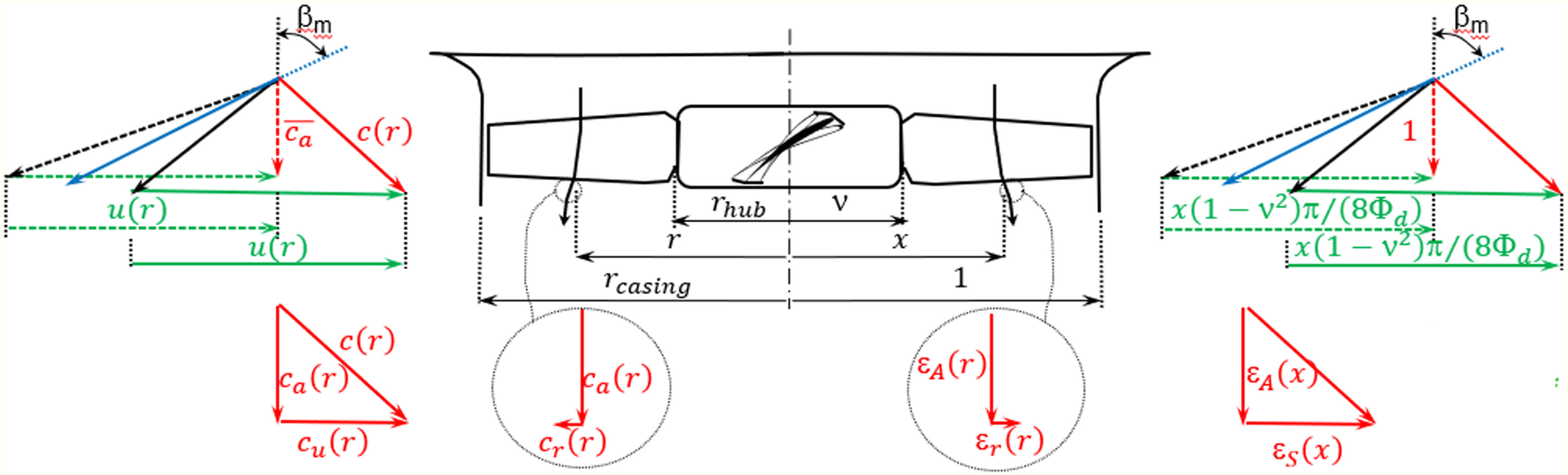 The non-uniform spanwise distribution of the work exchange imposed by the RB vortex distribution (εS(x) ∝ x) leads to the major implication that the higher the Ψd requirement is, the higher the minimum ν that allows operation without flow separation at the hub is. In fact, very few trials were necessary to state the impossibility to fulfil the present Ψd requirement without flow separation at the hub when ν = 0.5. It was therefore decided to increase the value of ν to 0.6 for the aerodynamic calculations, hereafter referred to as the “aerodynamic” hub-to-tip (νaero). This means assuming that the separation and flow reversal occurring at the “solid” ν is confined within a region that extends up to νaero, where a slip surface develops and behaves as a frictionless hub, at the cost of recirculation losses that penalise ηaer. The latter is therefore assumed equal to 50%. The additional assumptions of ηloc(x) = 0.85, as suggested in (Downie et al., 1993), and εS(x) = 0.875x permit the completion of the first design step, and specifically to: