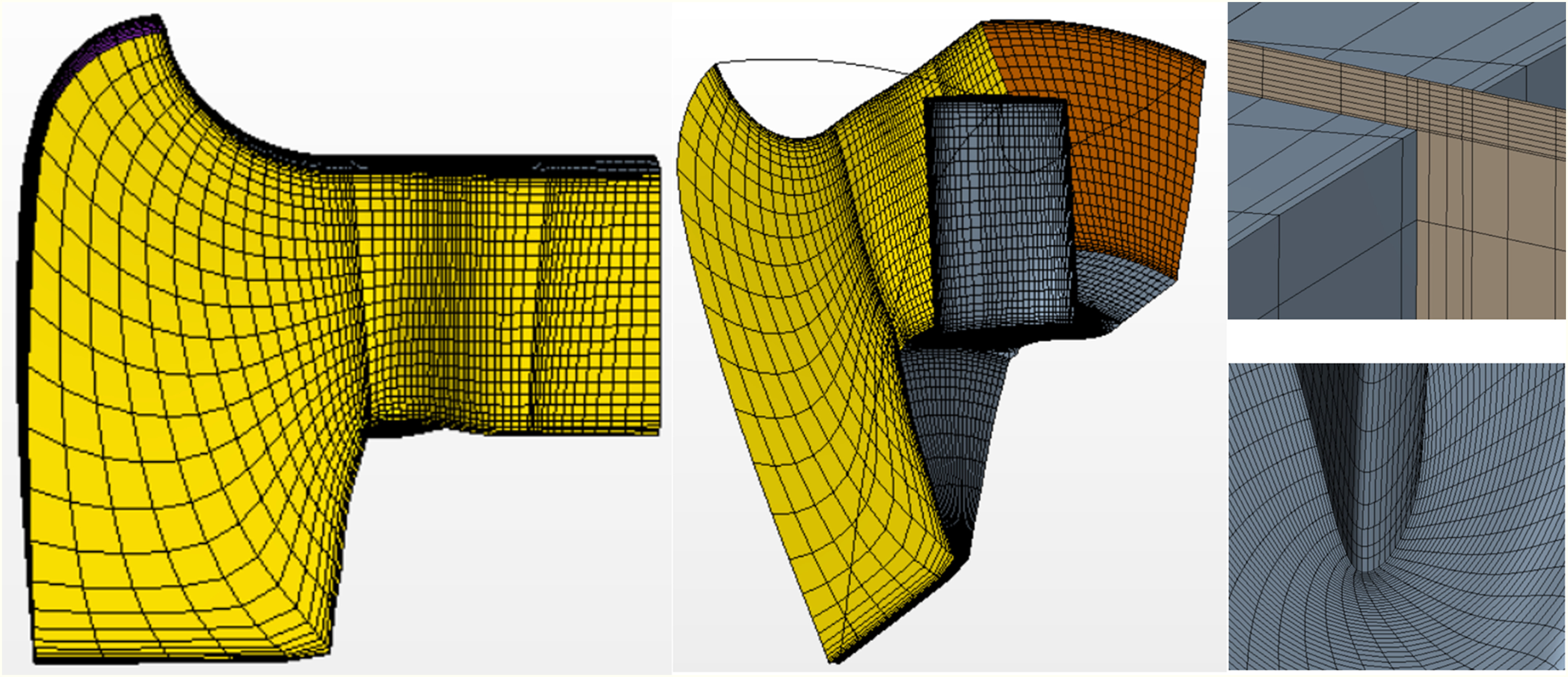 Surface grid of the computational domain: meridional view (left); perspective view (middle); detail of the blade surface grid and a meridional section of the volume mesh in the tip gap region (upper right); detail of the blade leading edge surface grid close to the hub (lower right).