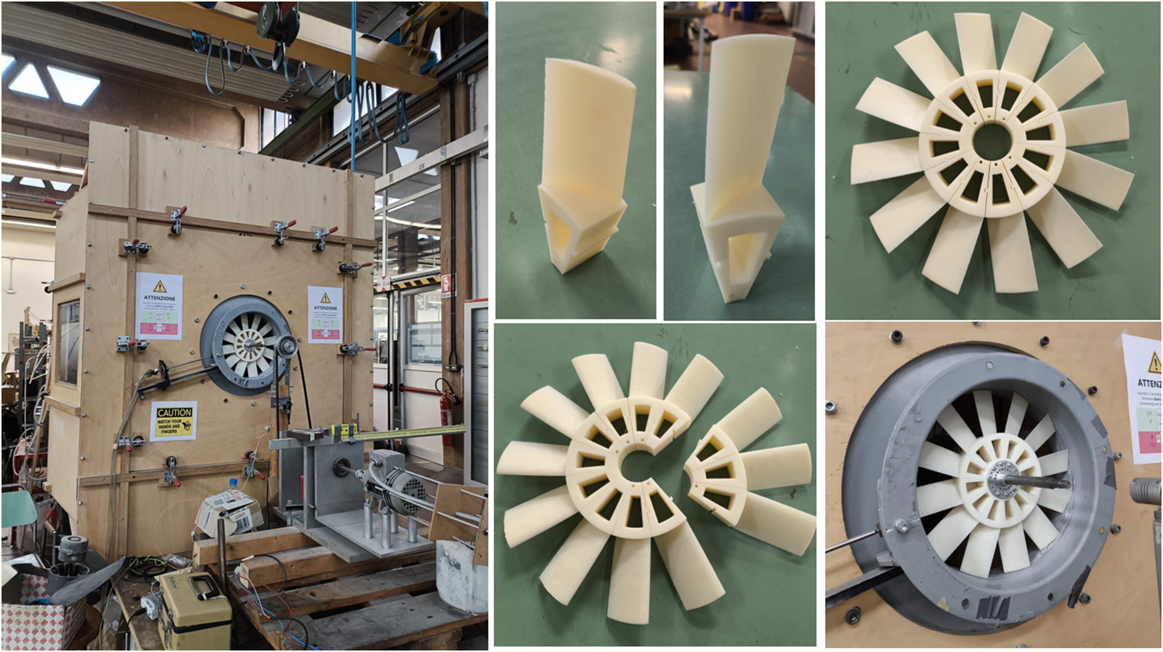 Aerodynamic global performance data were collected for the CS fan design, the rotor of which was manufactured in ABS by a rapid prototyping 3D printer in the size appropriate for the mounting on a 315 mm inner diameter casing taken from a commercial industrial fan. The two middle frames of Figure 4 refer to the details of the rotor mounting (where the strategy adopted for the blade assembling clearly emerges), whereas the two right frames show the complete CS rotor and the CS fan mounted on the rig, respectively.