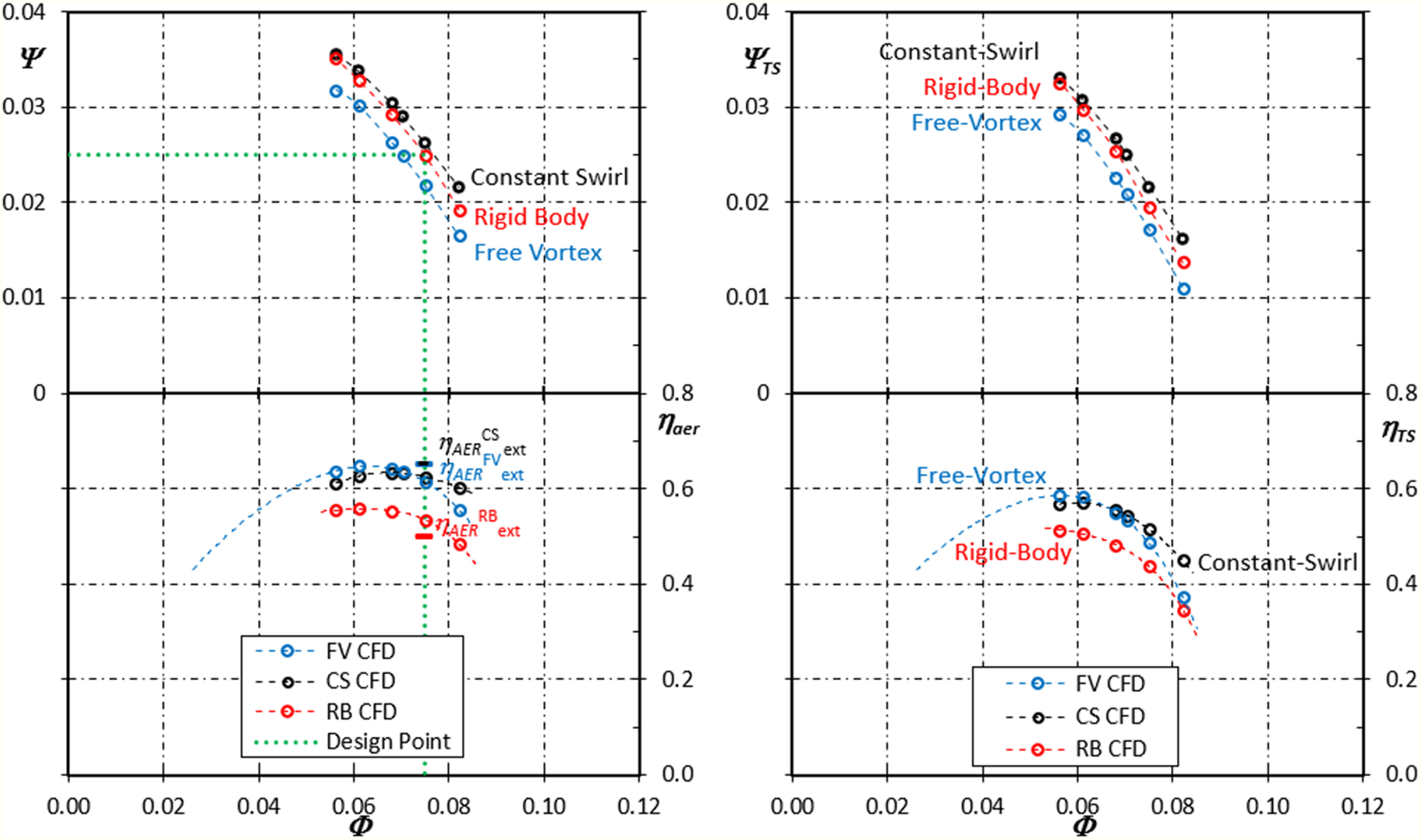 Second, Ψ requirement at design is fulfilled by all designs except for FV (see the left-side-frame in Figure 6). Nevertheless, considering the higher Ψ predicted at peak ηaer operation for the FV fan, it is possible that also such design succeeds in the fulfilment of Ψd at Φd with ηaer comparable with the CS design. In fact, 2° to 3° adjustment of the blade position angle could allow achieving the duty point without strongly penalising the peak efficiency value, as for the case considered in (Masi et al., 2022b). Exactly because of the same argument, it is not expected that any blade positioning change could allow the RB design to approach the CS efficiency, whereas it is very likely RB design could exceed the CS design in terms of Ψd. Much the same observations hold in qualitative terms for the exhaust-installation case (right-side frames in Figure 6).