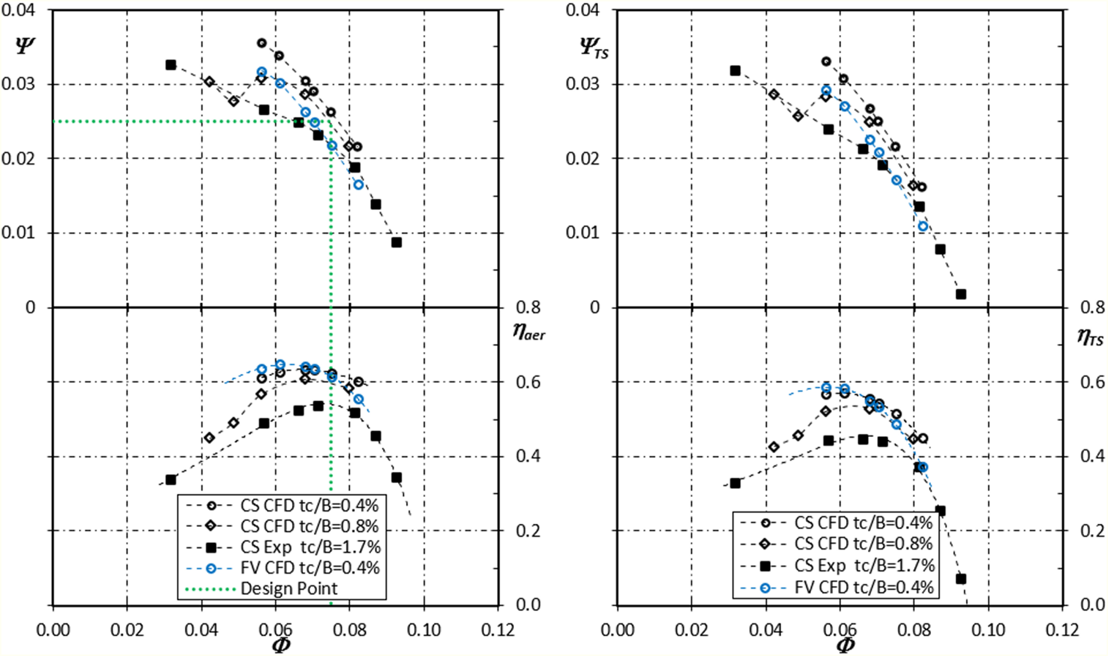 The experimental results underline the relatively high-pressure capability of the CS design, which is still able to match the FV design point operation even if manufactured with 4 times higher tc, although the corresponding efficiency decrease is very important. On the other hand, the CFD results indicate that when tc of the CS design is two times the tc of the FV design, the CS fan is still able to fulfil the original design requirement (not matched by the FV fan) with ΨTS higher than the FV fan and much the same ηaer and ηTS.
