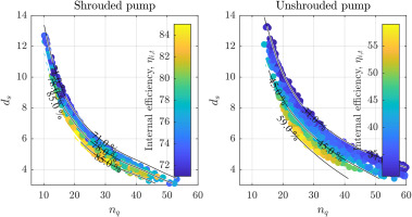 Regression models for shrouded (Equation 15) and unshrouded pumps (Equation 17) were developed to predict the pump efficiency as a function of nq and ds based on the contour lines. Equations 16 and 18 can be used to estimate the ideal impeller outlet diameter, leading to the maximum efficiency (Table 3).
