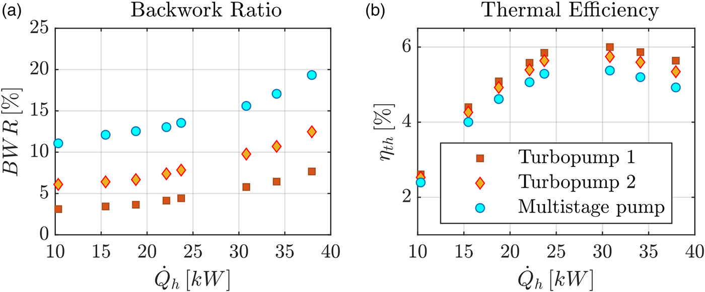 An existing ORC system designed for waste heat recovery from truck engines is used as a baseline to investigate the influence of the developed turbopumps on its performance. The system incorporates a small-scale, oil-free 8 kW radial inflow turbine supported on gas-lubricated bearings developed and tested by Rosset et al. (2021). Initially, the ORC system was driven by a 27-stage GRUNDFOS (CRNE 1–27) centrifugal pump with a maximum rotational speed of 3,000 rpm to achieve the required pressures. Excluding its drive, this commercial pump has a height of 716 mm and a volume of 51 L. In contrast, the tested small-scale turbopumps occupy only 3% of the commercial pump volume. Figure 9 compares the performance of the ORC system using the small-scale turbopumps with the original multi-stage centrifugal pump. The results suggest that the back-work ratio (BWR, see Equation 27) decreases up to 11.6 points and 6.8% points of the generator output power and is 67 and 42% lower for turbopumps 1 and 2, respectively, compared to the commercial pump. Moreover, the figure suggests that in addition to offering a much more compact solution (factor 33), using small-scale turbopumps can lead to a mean increase of 0.51% points in thermal efficiency.
