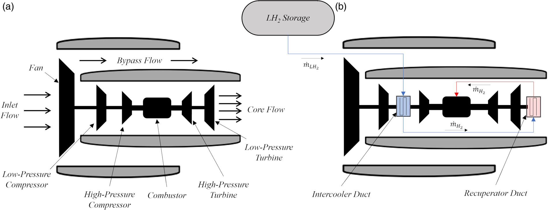 (a) Generalised propulsion system model for CFM56-7B26 and LEAP-1B27 turbofan models (b) Intercooled-Recuperated engine configuration for hydrogen-powered aircraft.