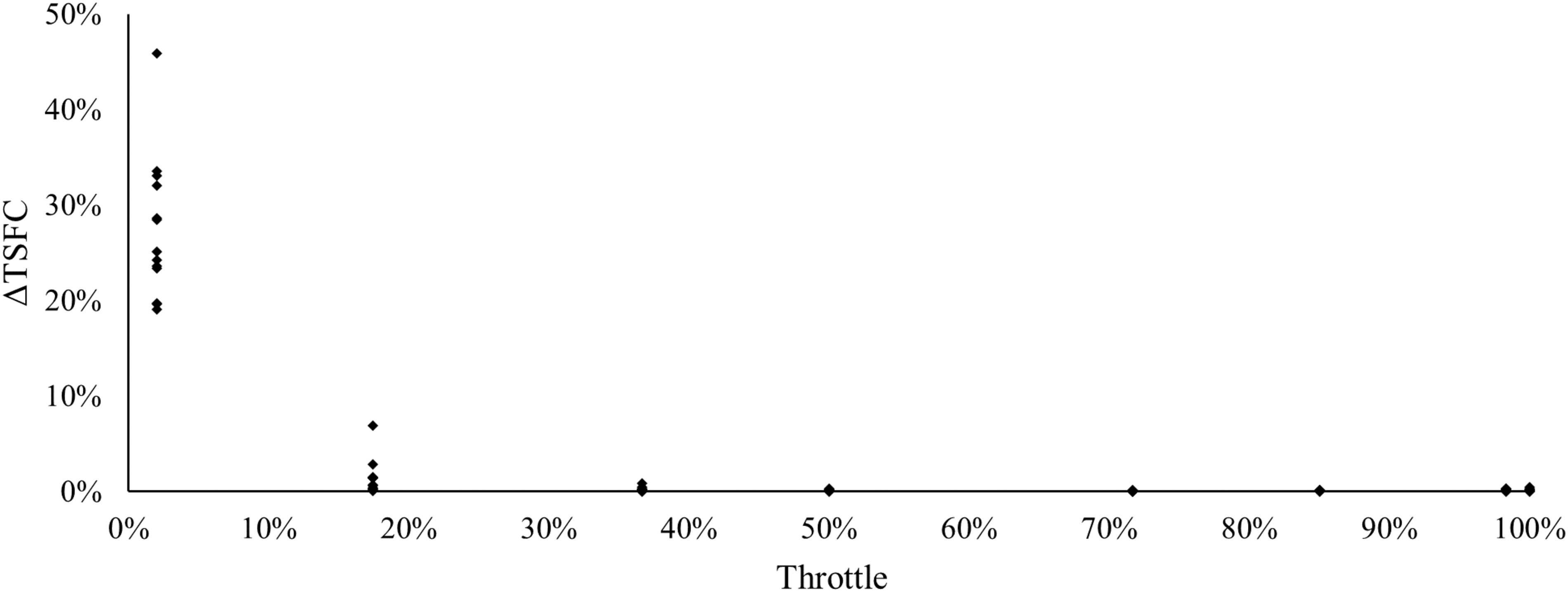 Surrogate models representing the thrust and TSFC of each engine configuration were generated in order to connect the NPSS models to SUAVE, and were generated using Gaussian regression methods (Rasmussen and Williams, 2006). Initially the ΔTISA values were included within the surrogate model formulation, however this resulted in prohibitively slow surrogate model evaluations for the current study. Instead, to include the temperature effects, separate surrogate models were developed for ΔTISA values of 0, ±10°F and ±27°F, where the final thrust and TSFC predictions within the real-world operations model were generated through linear interpolation between the outputs of the appropriate models. This method generated improved accuracy compared to not including temperature effects, while maintaining sufficient computational efficiency. The final surrogate models yielded r-squared values >0.9999, and the models were tested against a range of unseen test data. The test data consisted of 104 operating points at a range of unseen altitude, Mach numbers, throttle, and temperature values, in order to evaluate the maximum possible surrogate prediction errors. Figure 2 shows the relative prediction errors for the kerosene-powered LEAP surrogate model against the NPSS model simulation outputs, where 85/104 points were predicted with <1% error, with the majority of these almost equal to 0%. All 19 points with >1% error were for operations below 20% throttle, with 13 of these points at 2% throttle. Although there are significant errors for the 2% throttle operations, the fuel-flow rates for these operations are low and have a negligible impact on the overall fuel burn prediction accuracy over a complete flight, which is observed during the validation of the total aircraft model. Therefore, the surrogate modelling method was deemed to be an acceptable trade-off for prediction accuracy against computational efficiency.