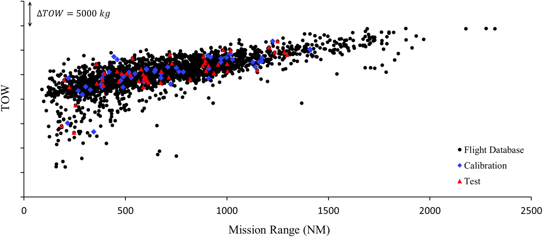 To perform the calibration of the B737-NG aircraft model, a subset of 50 B737-NG flights were selected from the flight database and place into the calibration dataset using a random sampling method. In order to maintain sufficient representation of the wider database, the calibration dataset was generated such that the mean of the mission range and TOW were kept within 1% of the complete flight database, while the sample standard deviations were maintained within 10% of the complete flight database, which was achieved through generation of thousands of random samples. The 50 selected flights are illustrated in Figure 3, superimposed on the complete flight database. Using the same approach, a further 50 flights were placed in the B737-NG test dataset. Due to the limited available data for the B737-MAX aircraft, 19 flights were manually selected and placed in the calibration dataset, leaving four remaining flights that were placed in the test dataset.