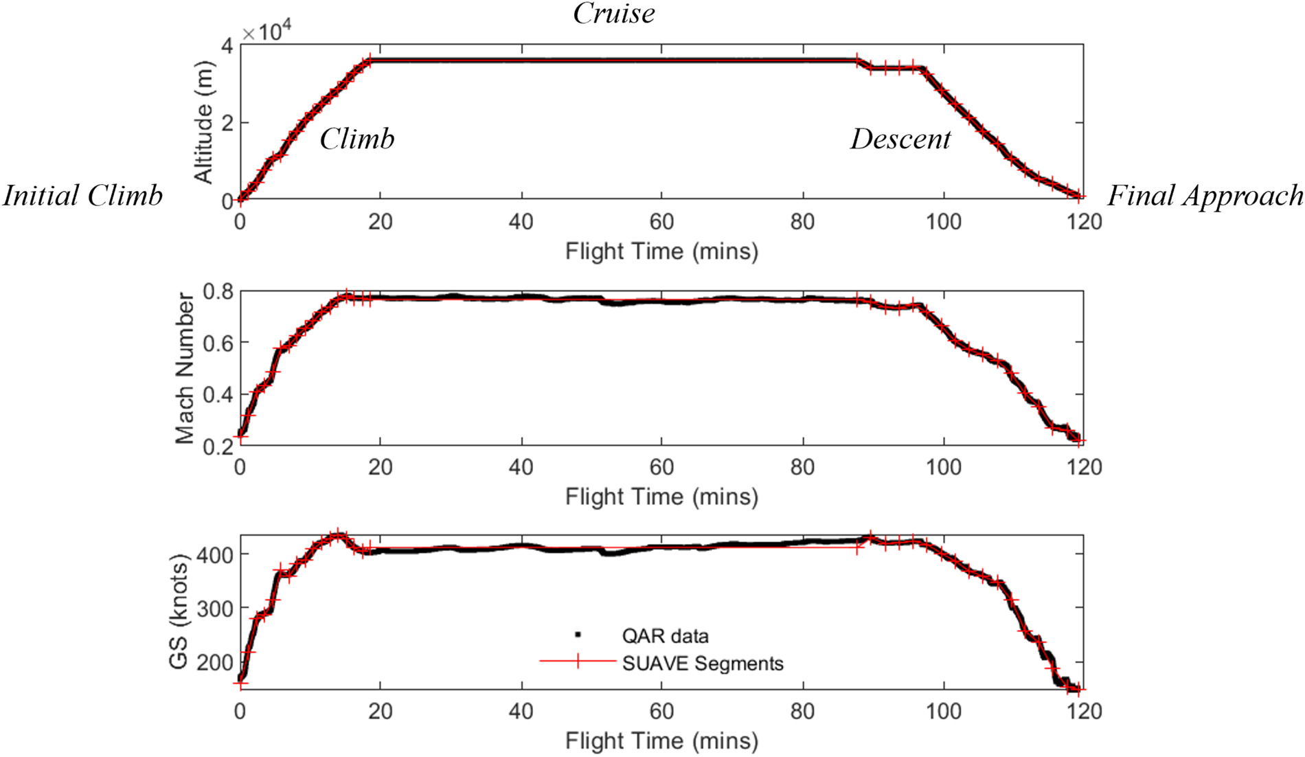 Figure 4 shows an example flight path approximation of a multi-cruise flight with step-climb segments. The linear SUAVE flight paths were approximated using a least-squares approach in an automated MATLAB software routine, formulated using the QAR flight data. The generated SUAVE segments are highlighted in Figure 4, which show good agreement with the actual flight paths obtained from the QAR data. The flight segments within the climb and descent phases were simulated using a linear-Mach number and constant rate of climb/descent, whereas the cruise segments were simulated using a constant Mach number and constant altitude. During the flight simulations, the linearised equations of motion were solved to achieve convergence for each segment within the mission. More details on the SUAVE mission simulation process can be obtained from Lukaczyk et al. (2015).