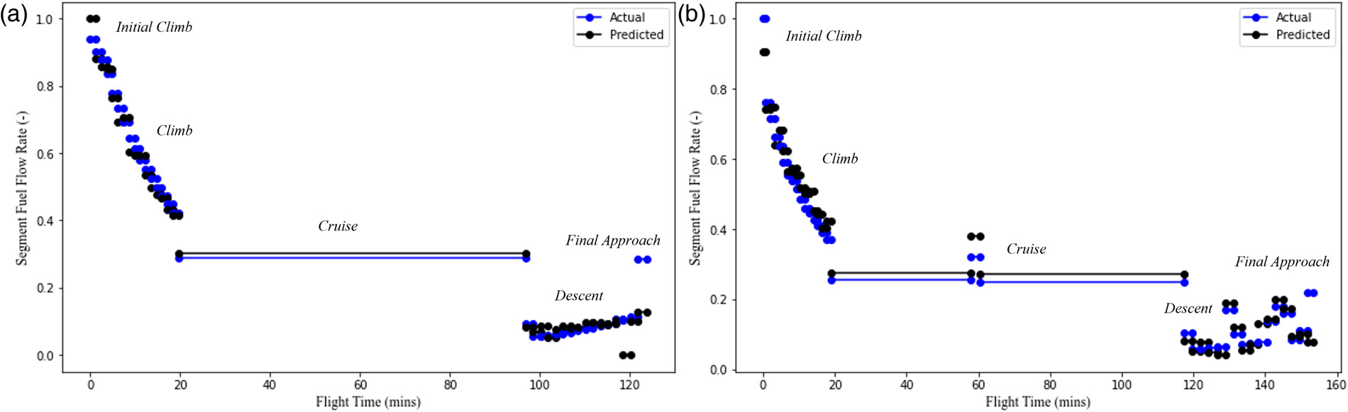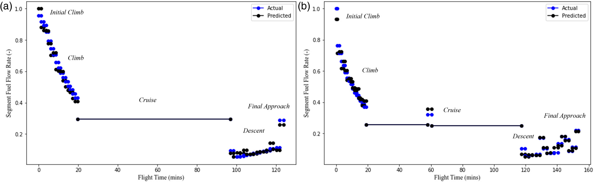 A preliminary validation of the B737-NG and B737-MAX models was conducted to assess the fuel-flow accuracy of the uncalibrated model over a broad spectrum of range of real-world flight data. To the authors’ knowledge, no such validation exists in the published literature for a physics-based low-fidelity model, which represents a further novel aspect of this study. The preliminary validation model consisted of the standard, uncalibrated SUAVE aerodynamic model, combined with the NPSS propulsion surrogates and the real-world operations model for the mission analysis. A sample flight validation with normalised fuel-flow values is presented for the B737-NG and B737-MAX models in Figures 5a and 5b, respectively. The average fuel-flow error magnitude per segment and the average mission fuel burn error magnitude for each validation sample set is presented in Table 2. Note that the uncertainty of each fuel-flow measurement within the actual flight data was ±2 lb/hr.