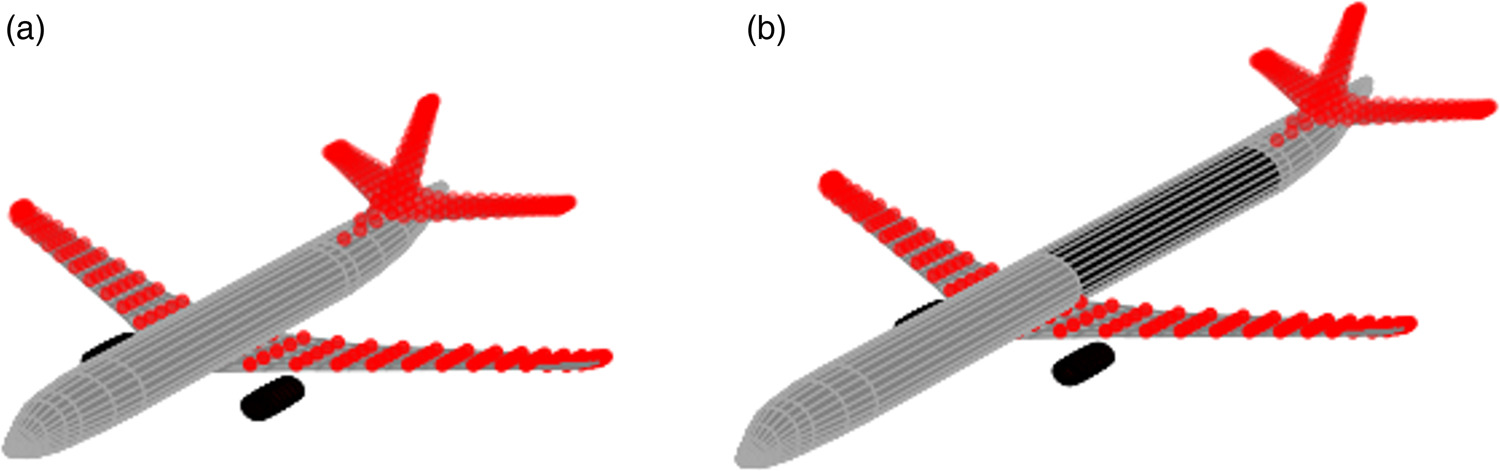 The final LH2 aircraft designs are presented in Table 6, where a B737-NG-LH2-0.33 configuration refers to an LH2 B737-800NG aircraft sized with a GI of 0.33, powered by a baseline LH2 engine (i.e., no intercooling/recuperation), whereas a B737-MAX-LH2-IRE-0.50 configuration refers to a LH2-powered B737-8200 aircraft sized with a GI of 0.50, with an intercooled and recuperated LH2 engine. The SAF-labelled aircraft refer to the conventional configurations (assuming identical fuel properties compared to Jet-A1), which are listed in Table 6 for reference. An example of the aircraft geometries generated within SUAVE are shown in Figures 8a and 8b, where the points highlighted in red represent the control points used in the VLM aerodynamic calculations, and the darker fuselage segment highlights the location and size of the LH2 fuel tank.