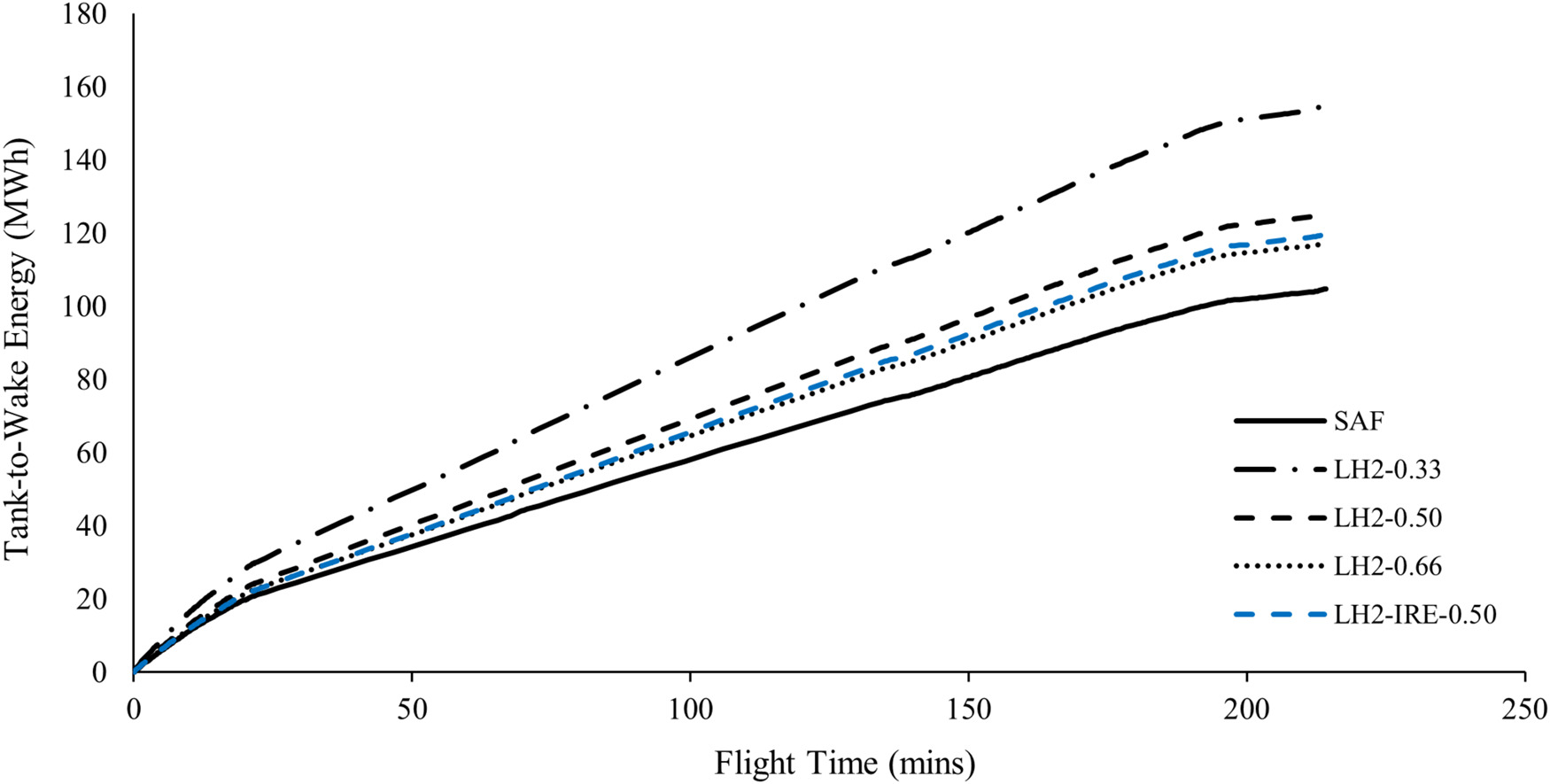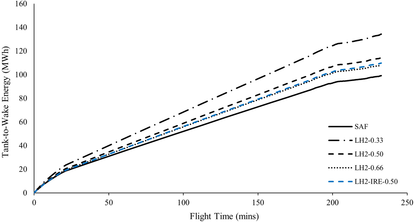A sample flight with a mission range of approximately 1,500 NM was selected from the operation schedule to analyse the TtW performance of each aircraft, which is illustrated in Figure 9. These results clearly shows the detrimental impact of a low GI value on the in-flight energy performance, as the LH2-0.33 configuration yielded a 48.4% increase in energy for the 1,500 NM flight when compared to the SAF configuration, largely due to the significant difference in TOW value, which was 43% greater than the SAF aircraft. This resulted in a significantly higher rate of energy consumption during each flight phase, especially for the climb phase due to the increased induced drag. However, the compounding effect of the GI value on energy performance is observed in the results of the LH2-0.50 and LH2-0.66 configurations, which yielded more moderate performance penalties of 19.8% and 12.1%, respectively. The LH2-IRE configuration with a GI value of 0.50 resulted in a 14.4% performance penalty compared to the SAF aircraft, highlighting the potential of an LH2-IRE as an enabling technology to bridge the in-flight performance gap between LH2 and SAF.