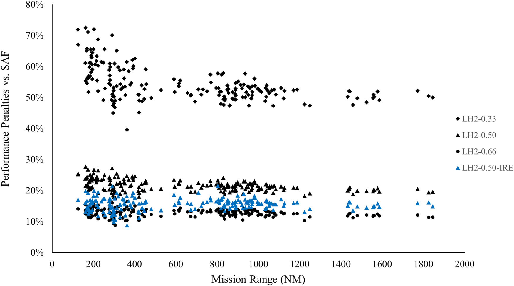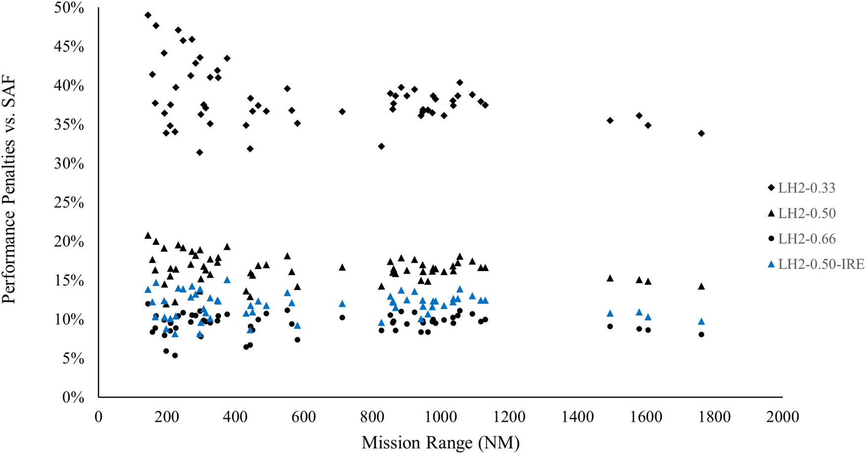 Figure 10 shows the TtW energy performance penalties, i.e. the relative increase of in-flight energy consumption, for each LH2 aircraft configuration when compared to the conventional SAF aircraft for the full range of B737-NG operations. An interesting trend is observed for the LH2-0.33 aircraft, which yielded significantly increased performance penalties for missions with a range <500 NM, reaching penalties >70%. This was due to the higher Operating Empty Weight (OEW) coupled with lower fuel weight savings for short-range missions associated with the lower mass of the LH2 compared to SAF. A similar, albeit much less exaggerated, trend was observed for the three remaining LH2 candidates, with slightly increasing relative performance penalties towards short-range missions, reaching a maximum of 27.7% and 16.0% for the LH2-0.50 and LH2-0.66 aircraft, respectively.