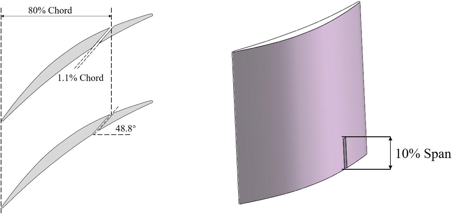 Blade slotting is a passive control method. By opening a channel between the pressure surface and the suction surface of the blade, the fluid flows from the pressure surface to the suction surface along the channel driven by the pressure difference, which forms a jet impact on the low-energy fluid and weakens the separation. The concept of blade slotting was first introduced into compressor by Rockenbach (1968), and a series of experimental studies were conducted by NASA (Keenan and Bartok, 1968; Mikolajczak et al., 1970; Rockenbach, 1968). They made slots in different rotors and stators and compared them with datum blades. The results show that blade slotting can control the trailing edge separation and reduce the wake width, but it cannot control the separation near the end-wall. The scholars have carried out slot research on the cascades. Zhou et al. (2008a,b, 2010) conducted full-span slotting and studied the effects of different slot widths, angles and positions on cascade performance through experimental and numerical methods. Ramzi et al. (2011), Ramzi and Abderrahmane (2013) conducted numerical calculations of slot on 2D profile and full-span slot on 3D cascade, and believed that slotting could control the suction surface separation and end-wall separation. Wang et al. (2012) found that when the negative incidence angle is large, the slotted cascade may increase the suction surface separation, which makes the cascade performance worse. Jiaguo et al. (2018) developed a slotted control method for high-load cascade separation, and conducted experimental and numerical studies. It is found that jet inhibits the development of corner separation. Blade slotting greatly improves the aerodynamic performance of the cascade under separation conditions, but causes additional losses without separation conditions. Because the full span of cascade is slotted, the 2D profile is actually changed.