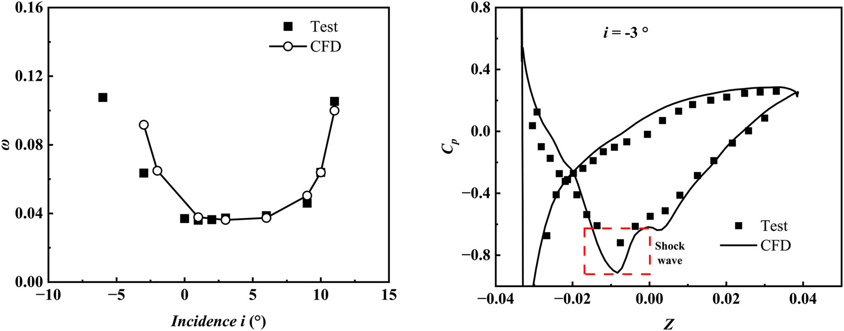 Comparison of total pressure loss coefficients (left) and static pressure coefficients (right) between test and CFD of datum cascade.