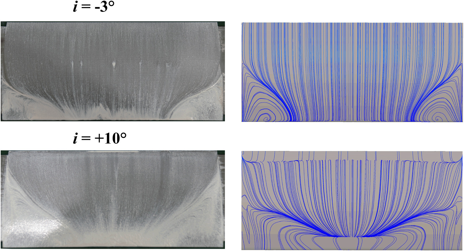 The intensity of the shock wave in the simulation result is greater than the test results. The difference in the loss when incidence angle is −3 deg was mainly produced in the shock wave. The streamlines on blade surface of test and simulation were also compared in Figure 5. The simulation of different incedences can well predict the region of separation. Based on the above comparison, simulations in this paper are reliable.