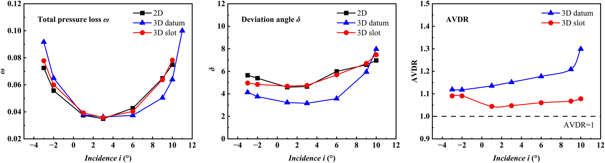Performance varying with incidence at mid-span (left: total pressure loss, middle: deviation angle, right: AVDR).