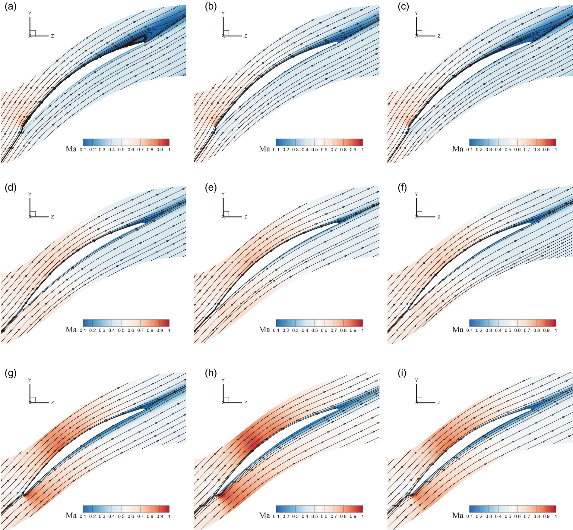 Mach number contours and Streamlines under typical incidences: (a) 2D, +9 deg, (b) datum, +9 deg, (c) slot, +9 deg, (d) 2D, +1 deg, (e) datum, +1 deg, (f) slot, +1 deg, (g) 2D, −3 deg, (h) datum, −3 deg, (i) slot, −3 deg.