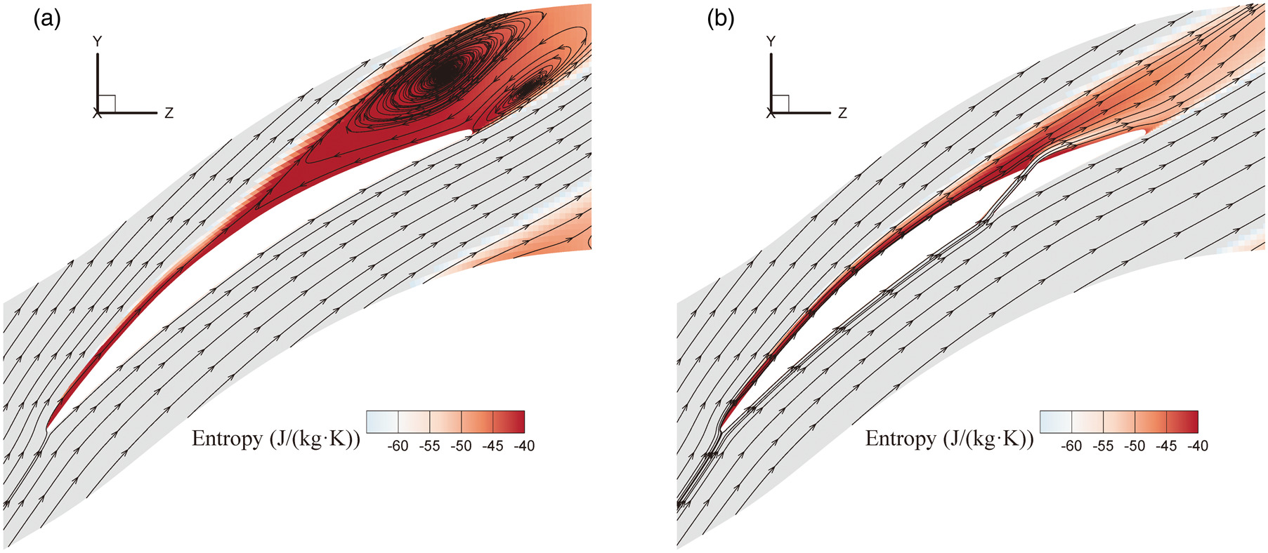 End-wall suction and blade slotting are the methods that can be used to control separation. End-wall suction is an active control method that reduces separation by directly suck out low-energy fluid near the end-wall. Many studies have adopted end-wall suction in cascade test (Erwin and Emery, 1951; Herrig et al., 1957; Song and Ng, 2004; Starken et al., 1975), and achieved good results. However, end-wall suction requires additional equipment and energy. On the other hand, for different cascades and working conditions, the size and position of the end-wall separation are different, and the required extraction volume and position are also different. The corresponding guidelines are lacking.