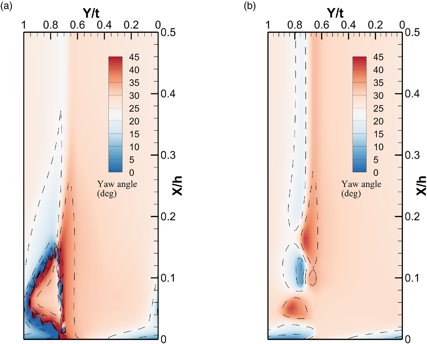 Figure 11 shows the yaw angle contours of the S3 stream surface at 20% chord downstream of the trailing edge. In the corner area of the datum cascade, a recirculation zone covering about 15% span appears, and a narrow trailing edge separation occurs above 20% span. In the corner area of the slotted cascade, the original separation area disappears and two new separations appear. The passage vortex formed between the suction surface leg of horseshoe vortex and the end wall boundary layer near the end wall (below 5% span). Due to the push of the slot jet, the passage vortex fails to mix with the trailing edge separation and fails to develop upward along the blade surface. The slot jet and trailing edge boundary layer form a vortex at about 10% span. The two separations failed to mix and develop under the splitting of the slot jet. Above 20% span, a wide trailing edge separation appears, which is the trailing edge separation of the 2D profile at this incidence