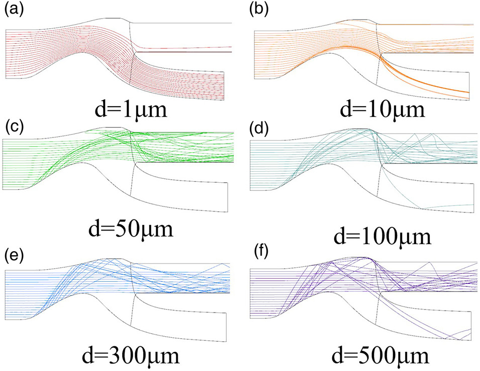 Accurately predicting the trajectory of the sand particles is critical for designing IPS because the air and sand particles experience different degrees of turning due to the differences in inertia inside the IPS flow path. According to the literature (Duffy and Shattuck, 1975a), the inlet particle concentration of IPS is about 0.05–2 g/m3, which leads to a tiny mass fraction so that particle-particle interactions and the effects of the particles on the air can be neglected. Thus, the discrete particle model was mostly used to predict the sand particles’ trajectory.