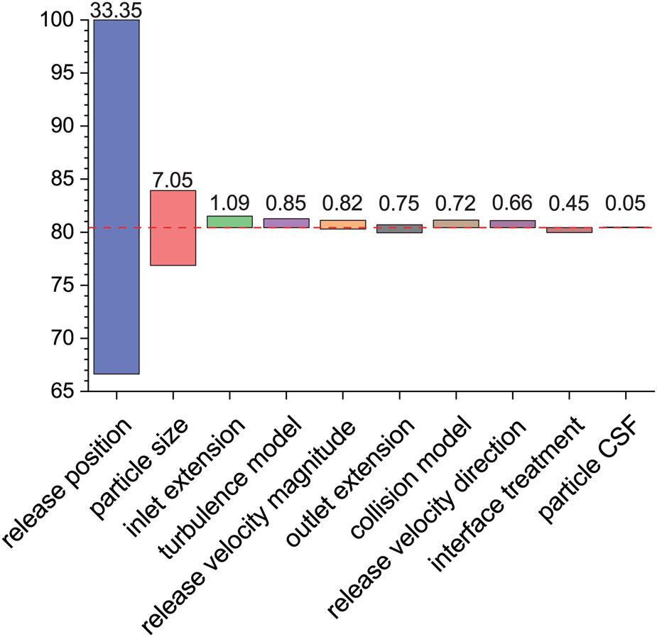 During the experiment, the uncertainty of separation efficiency due to the incomplete collection of sand particles (Barone et al., 2015; Xu and Chen, 2021) and the ambiguity of sand particle’s diameter (Duffy and Shattuck, 1975a) would be about 1%. As for computation, in addition to errors due to the discretization error of the governing equation and the error of the empirical model, there are also random errors caused by random parameters, such as the diameter distribution of sand particles, release position, and rebound effects. Considering the impact of these random factors, more than five calculations are conducted to get the mean value and standard deviation for each set of calculation input parameters.