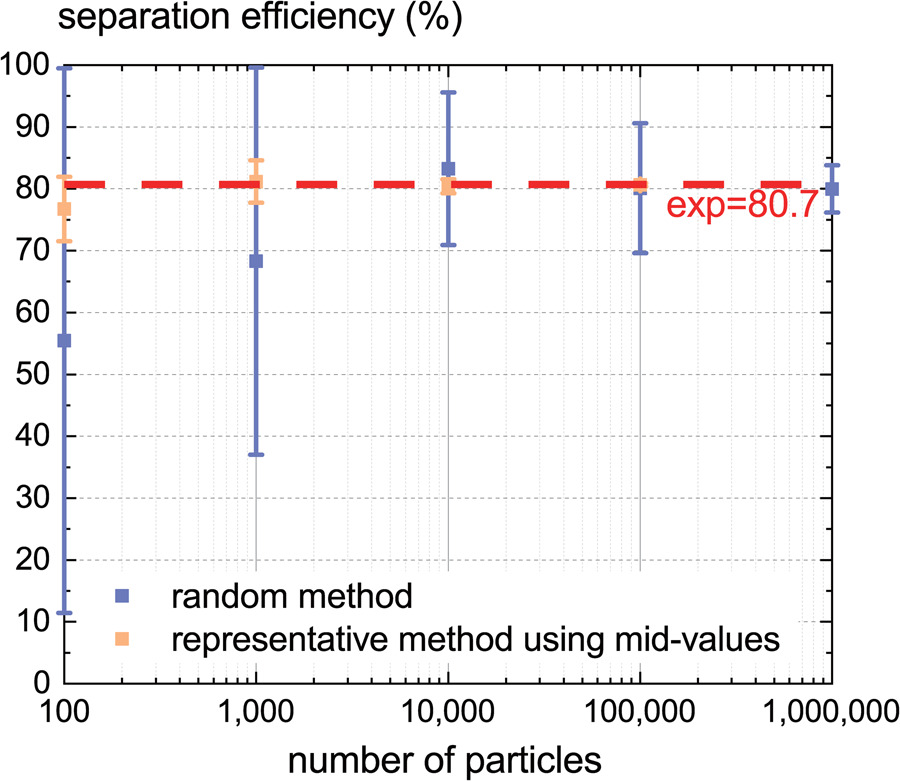 Results in Figure 8 also show that the separation efficiency can’t be predicted accurately even when the number of particles reaches 106 using the random method, while 104 particles seem enough for the representative method to get an adequately accurate result. Hence, the representative method using the mid-value of the subintervals and particle number of 104 is adopted hereafter.