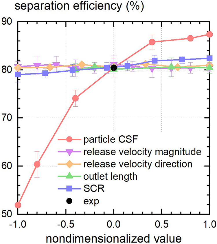 The CSF of sand particles and SCR are secondary parameters that can be set to proper constants. When SCR deviates from its design value below 5%, the error of separation efficiency won’t exceed 1%. The CSF of sand particles can be set as 0.5, while relaxation to 0.35–0.7 would lead to an error range of about 5%.