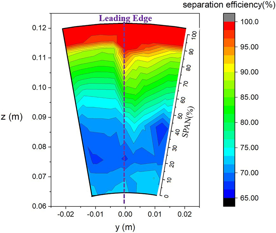 As the computation results are shown in Figures 5 and 6, the separation efficiency of sand particles with a diameter smaller than 10 μm is low because smaller sand particles are more tented to enter the core flow path together with air. For sand particles with a diameter larger than 30 μm, nearly all of them can be separated due to the dominance of inertial force, while unseparated sand particles are mainly rebounded by the hub and the shroud and then move into the core flow path.