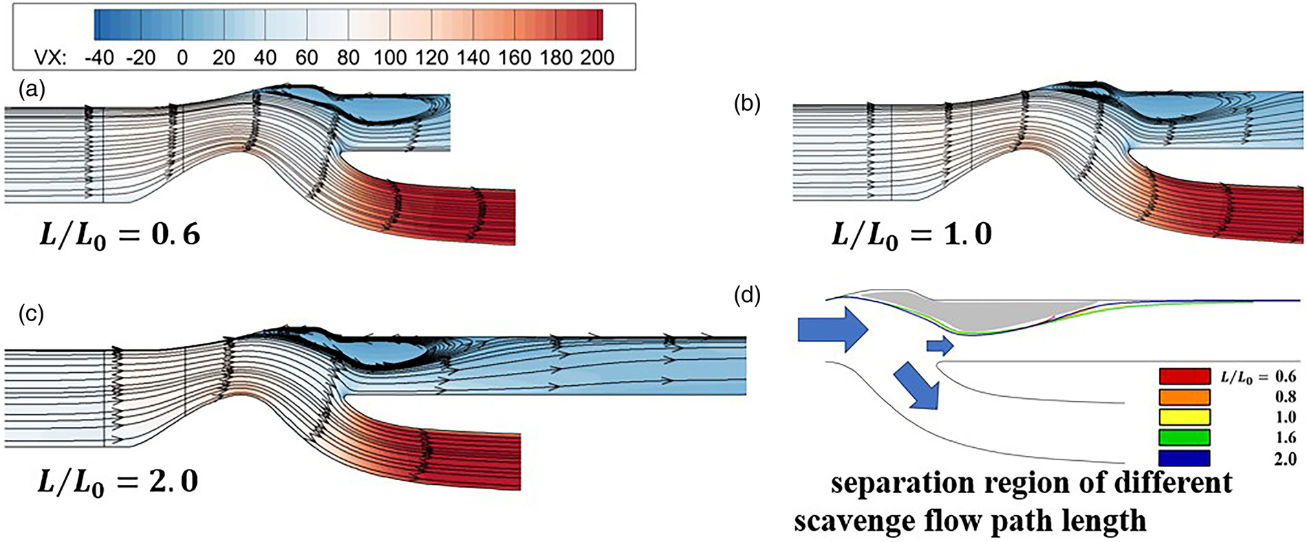 The influence of the bullet-shaped intake device's existence has been proven to be small, as shown in Figure 11. Although the distribution of sand particles at the blade's leading edge deviates from a random distribution in Figure 12, the final calculated separation efficiency is only about 1% higher. Also, the length of the scavenge flow path of the IPS is varied to identify its effects on separation efficiency. When the length of the scavenge flow path is taken as 0.6∼2 times its physical length, there is no significant difference in the flowfield (as shown in Figure 13). Thus, no significant impact on separation efficiency has been observed.