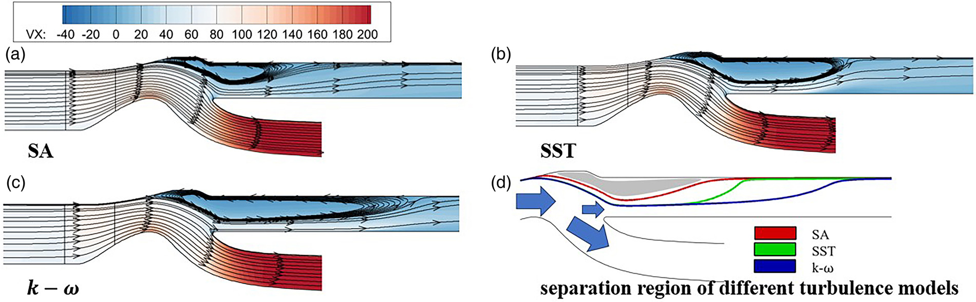The turbulence model plays an important role in determining the pattern of the flowfield, especially in the separation region. The improved Spalart-Allmaras model, SST model (Menter, 1994), and