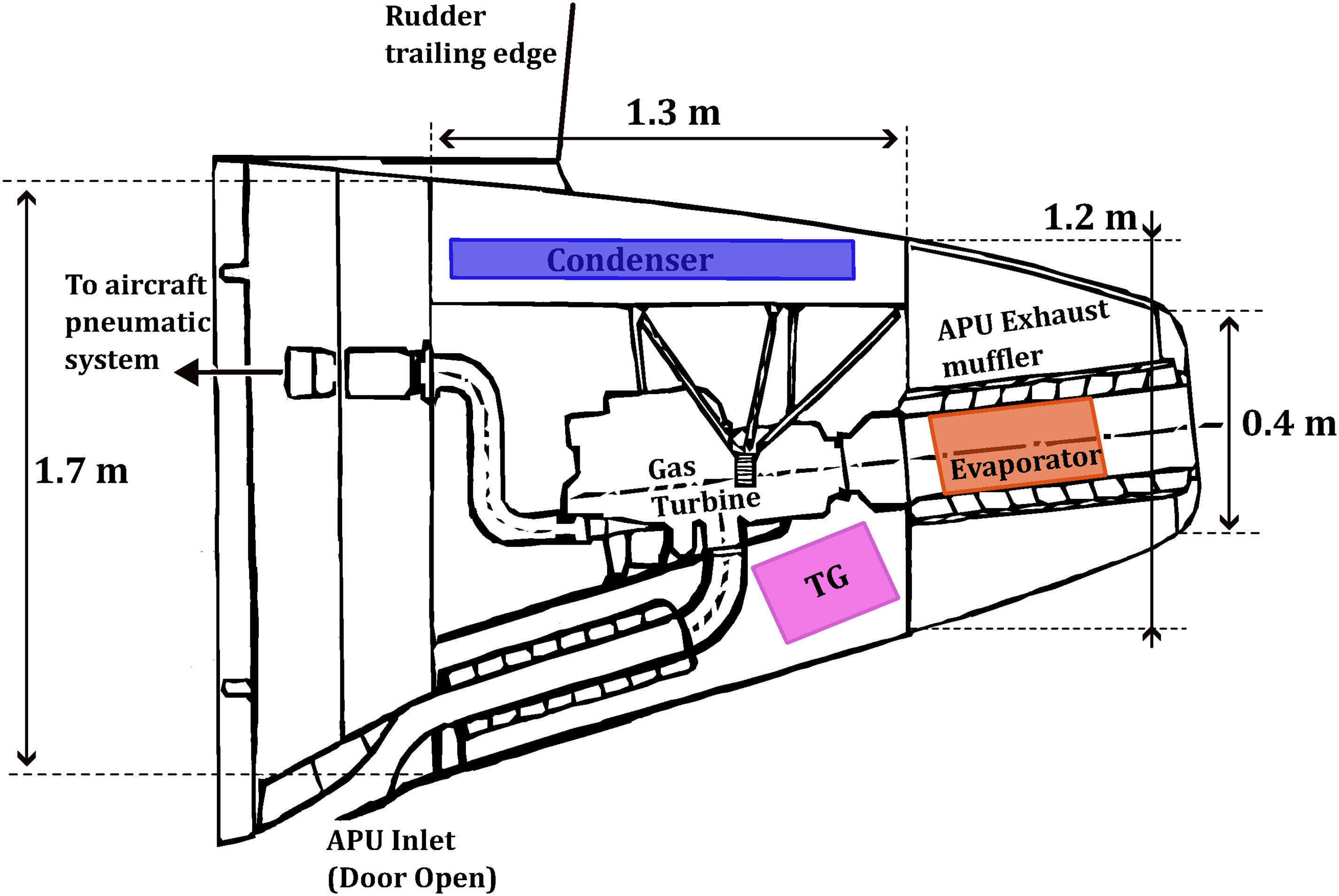 Sketch of the APU compartment based on Ref. (Stohlgren and Werner, 1986). The compartment dimensions are as reported in Ref. (Airbus, 2020). The shaded boxes, which are not to scale, indicate possible locations of the condenser, evaporator, and ORC turbogenerator (TG).