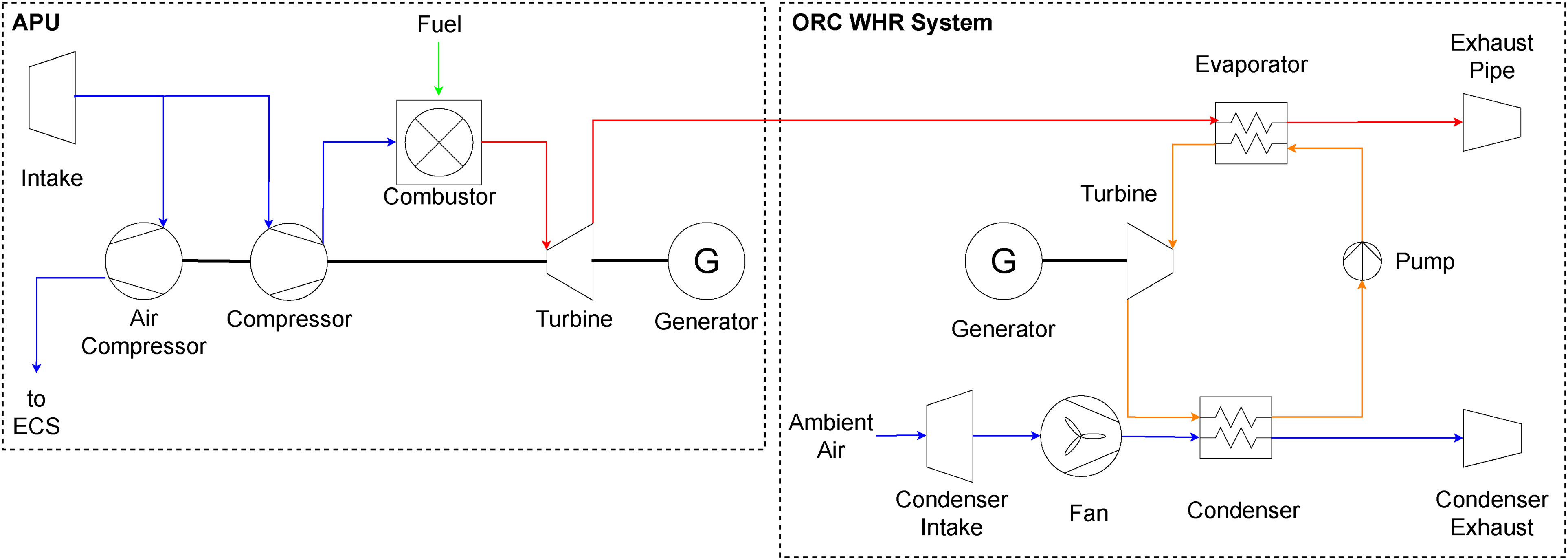 APU-related emissions can be lowered by increasing the availability of ground power at airports and by improving APU thermal efficiency. The thermal efficiency of gas turbines can be enhanced by increasing the overall pressure ratio (OPR) and turbine inlet temperature (TIT) and/or by further optimizing turbomachinery aerodynamics. However, some of these improvements are difficult to achieve if the power capacity is low. Small-scale effects penalize turbomachinery efficiencies and make turbine blade cooling unfeasible, which, in turn, limits the maximum TIT (Bentele and Laborde, 1972). One way of circumventing these inherent limitations on the thermal efficiency of small gas turbine engines may be the addition of an organic Rankine cycle (ORC) system to convert the thermal energy of the gas turbine exhaust into additional power. However, the knowledge base on the design of such systems and their impact on aircraft emissions is still very limited and inconclusive regarding the concept of waste heat recovery (WHR) onboard of aircraft.