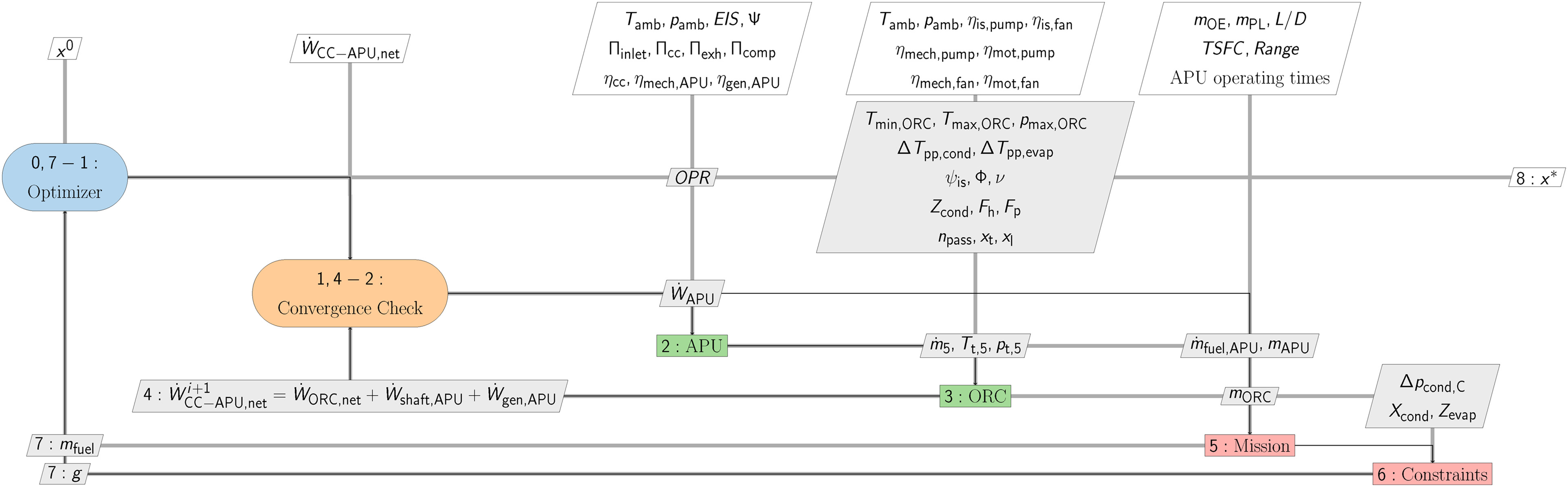 Numerical optimization is used to determine the CC-APU design that minimizes the mission fuel mass (mfuel). Therefore, the constrained single-objective optimization problem that is solved can be written as