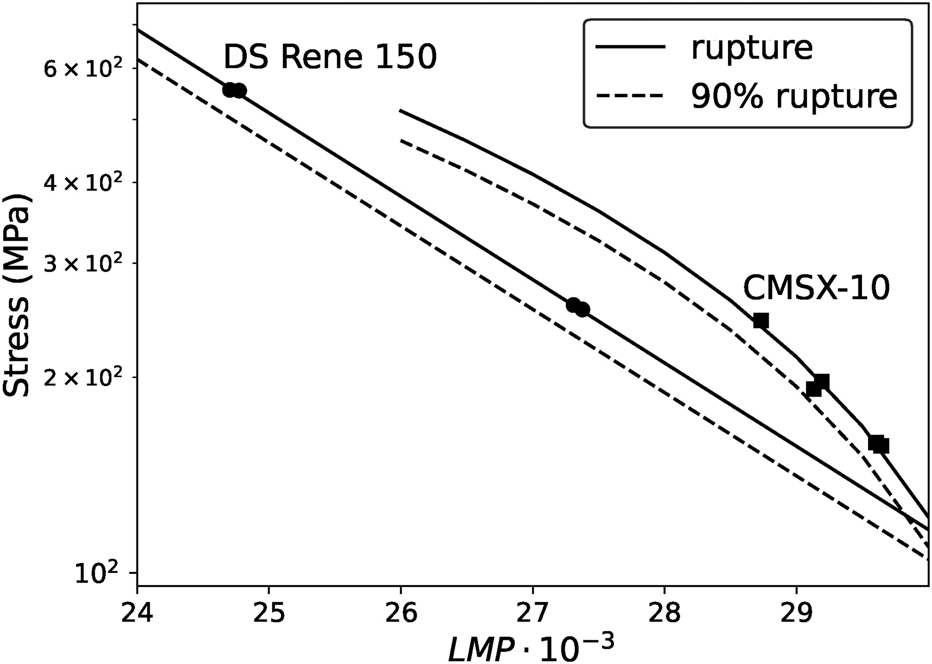Creep rupture stress and 90% creep rupture stress over LMP for 3rd generation single crystal alloy CMSX-10 and the directionally solidified (DS) nickel-base alloy Rene 150. The markers indicate experimental data points taken from Refs. (DeBoer, 1981; Erickson, 1996). A logarithmic curve fit is applied to the experimental data points of CMSX-10, which compares well with data provided in Ref. (Saravanamuttoo et al., 2017) and an exponential fit to the data of DS Rene 150.