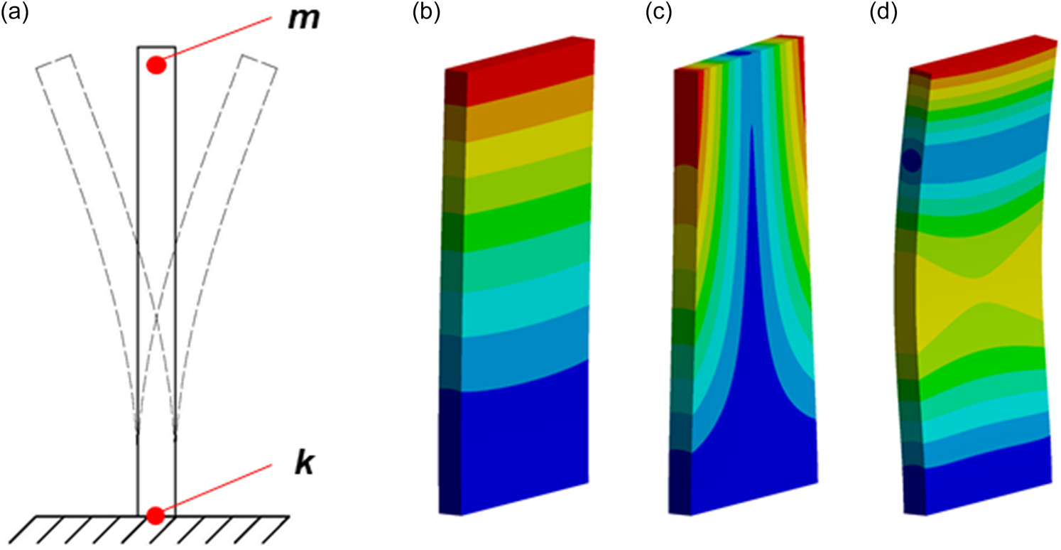 Figure 2 shows the deformations of the flat plate when vibrating and its resonance frequencies. Figure 2a shows the cantilevered beam vibrating at first bending mode. As known, the natural frequency of a beam is a function of its stiffness and an inverse function of its mass. It is also known that the stiffness of the beam is more important at a place of minimum deformations – near the fixed-point, whereas the mass is more critical at the free end of the beam. The two parameters and their locations of importance are sketched in Figure 2a. Figure 2c–d shows the first three vibration modes of the flat plate: first bending mode (B), first torsional mode (C) and second bending mode (D). For compressor blades, the modes are more complicated than for the flat plate, and the deformations would be of a mixed kind. Depending on the configuration, the first mode of the blade can be primarily bending or torsional. For the blade of interest, the former is the case.