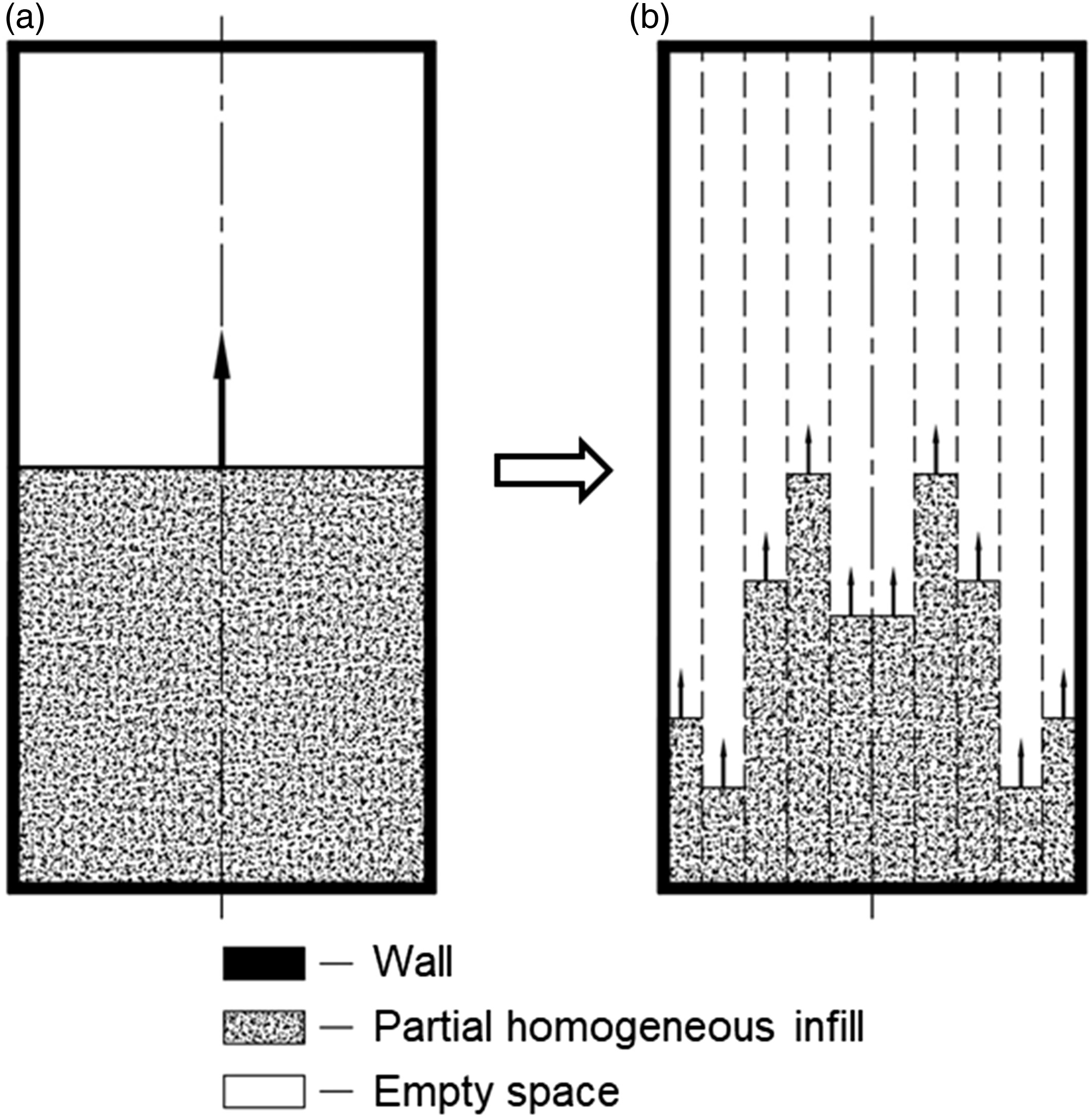 As a simplified example, a homogeneous infill type is used first in the paper, shown in Figure 3a. The filler originates from the bottom - where the fixed support is applied. This is to address the basic physical principle: the stiffness in this case is critical near the support - in a region of peak stresses, and the mass is critical in the region of highest deformations.