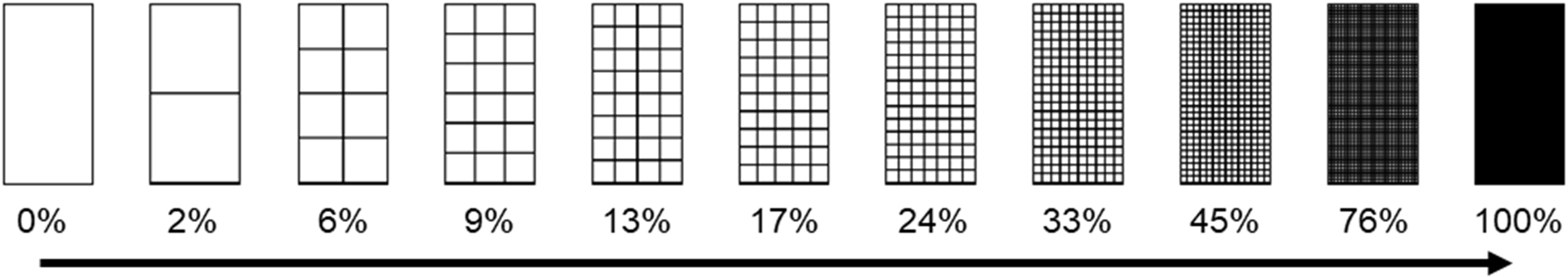A two-dimensional square-shaped structure (Figure 4) was used for this study as it allows for rapid design within complex blade geometries as well as robust geometry generation and meshing. The structures have a square cross-section and are uniform along the thickness of the blade. The walls have a constant thickness for all the options studied and are equal to the wall thickness of the plate. In Figure 4 several options are shown along the increasing filling ratio of the inner space. The percentage of volumetric infill shown as the horizontal axis in Figure 4 is calculated based on the cross-sectional area of the lattice. This is true for the flat plate and to some extent correct for the compressor blade of interest.