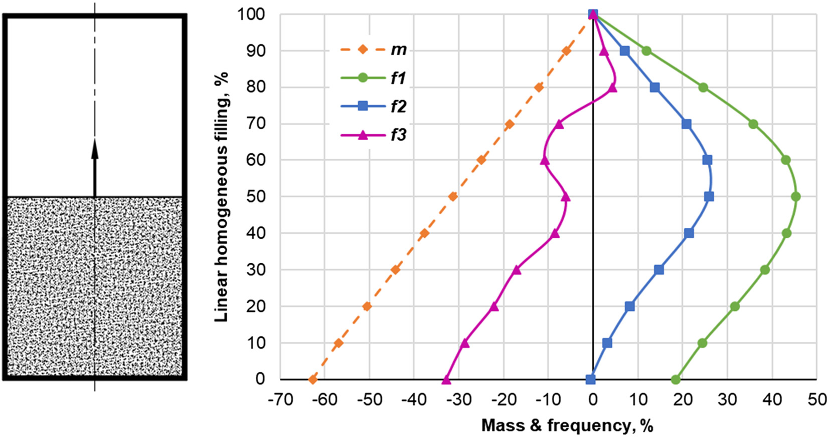 To understand the effect of the infill on plate natural frequencies, this section considers a linear homogeneous filling starting from the bottom end of the plate (Figure 5). The first natural frequency of the solid plate (100% infill on the vertical axis) is 499 Hz. All other modes for first three modes are given in Table 1 in percentage of the solid plate. The empty box (0% infill) has a higher first mode frequency of 591 Hz (18%) and mass reduction of 61%. However, the change in the frequency between the two extreme cases is not straight - there is an extremum at nearly 50% meaning that a half-filled hollow plate can have 45% higher first-mode natural frequency than the solid plate (726 Hz) and at the same time have 31% less weight. This 31% weight reduction can be sufficient to compensate for cyclic load stress limits which are normally lower for the 3D printed materials.